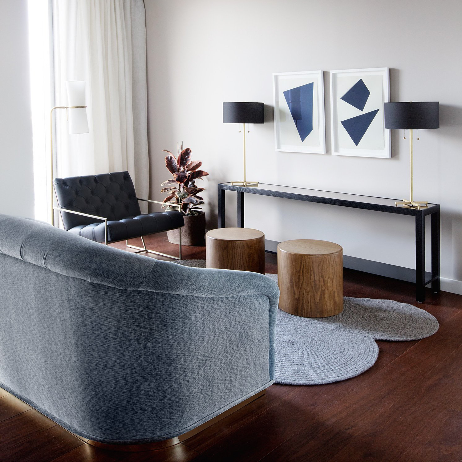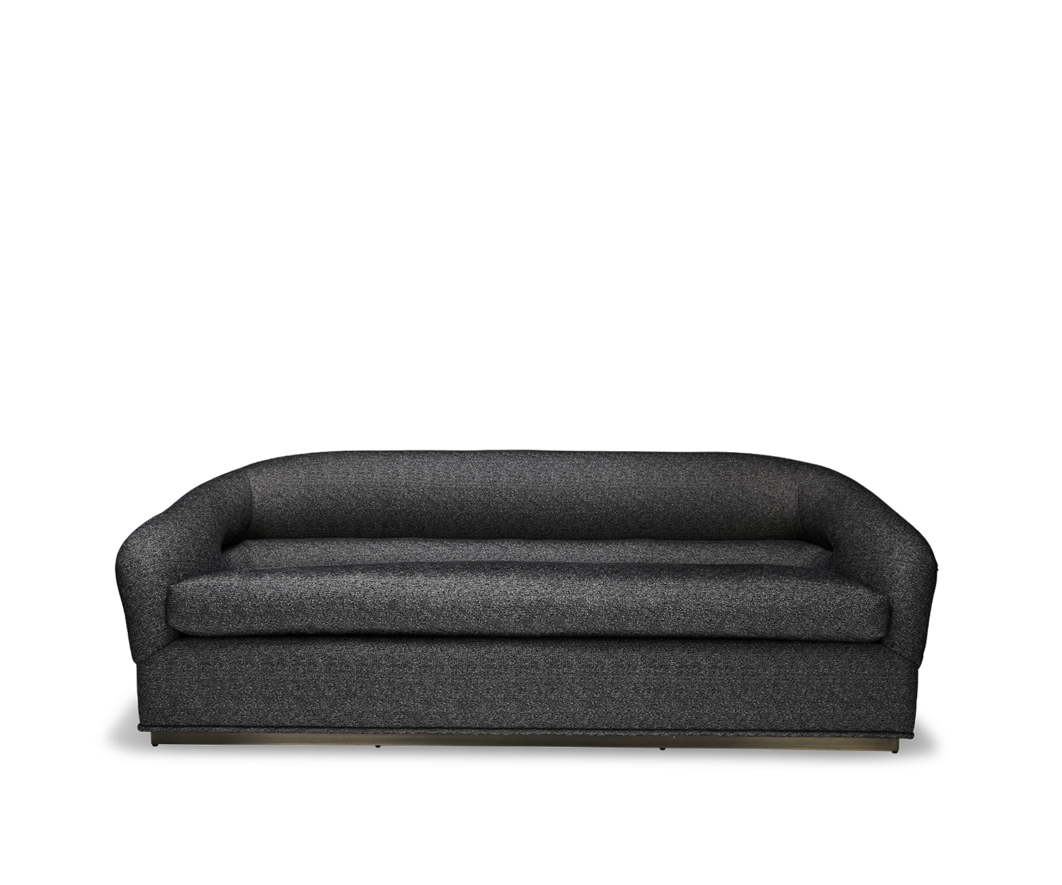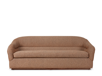 The Huxley Sofa is inspired by 1970's lounge furniture. A curvaceous form with a single line tuft and long seat cushion rest atop a polished brass base.