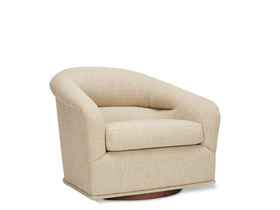 The Huxley Swivel Chair is inspired by 1970’s lounge furniture. A curvaceous form with a single line tuft and long seat cushion rest atop a base that swivels. Available with a matching ottoman.