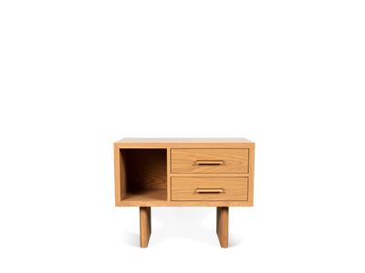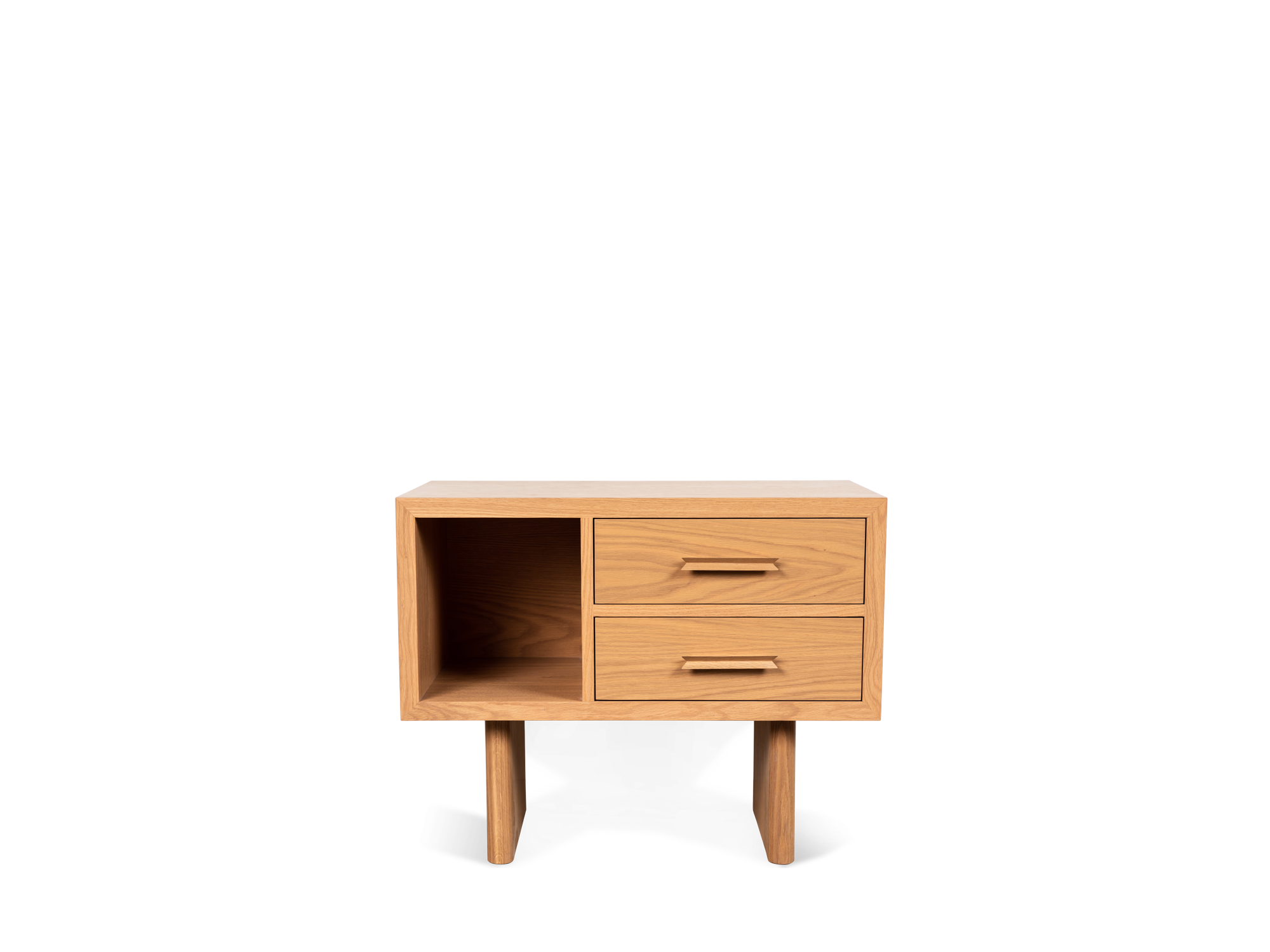 The Inverness Nightstand features two drawers with carved pulls and one open section on solid wood plank legs. Wall mounted version available. Specify at time of order.