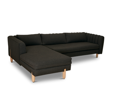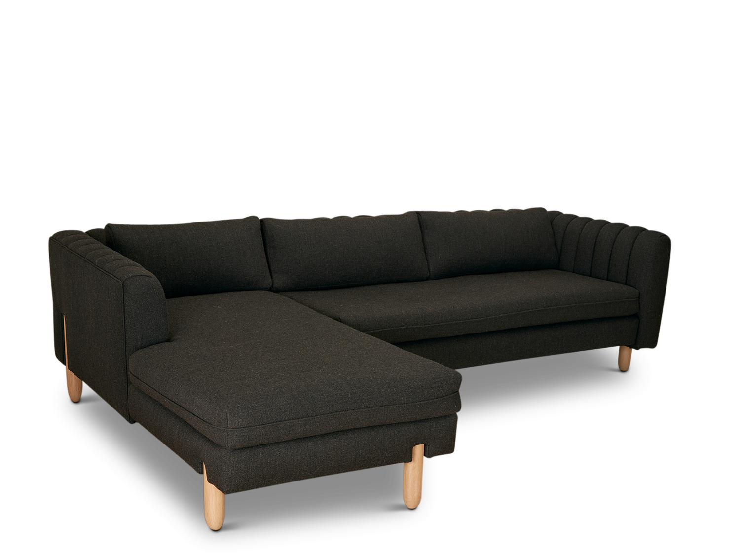 The Isherwood Sectional features a channel tufted body. The turned legs are made of solid white oak or American walnut and are inset on the sides. Also available as a sofa.