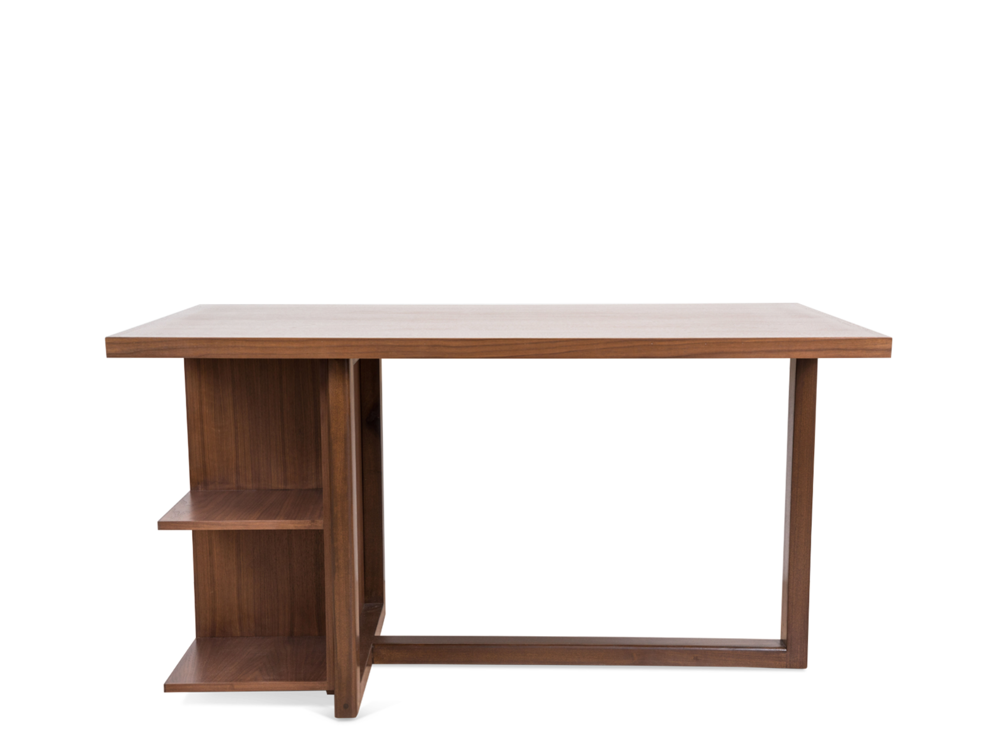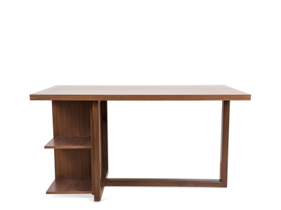 The Ivanhoe Desk features a cantilevered base with open display shelves. Available in American walnut or white oak and drawers are available upon request.
