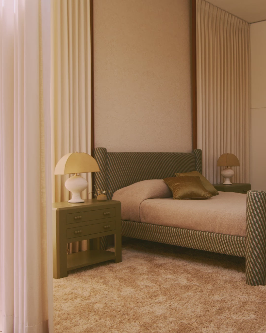 The Wagner nightstand with chamfered edges and drawer pulls inspired by turn-of-the-century Vienna. View complete JGDxLF Agapanthus Collection.