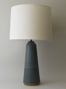 Tall and elegant, this tapered column shaped lamp features a tall body and an angled top. Offered in a refined a rich blue glaze with bronze undertones this stoneware lamp is handmade in California, and comes with an oatmeal linen shade and twisted brown cloth cord. Finish may vary with each edition due to the unpredictable nature of studio pottery.