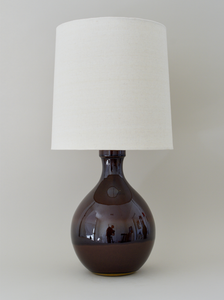 This unique lamp is a collection-worthy statement piece, boasting an elegant tapered top and a spherical base reminiscent of a bulb. Handmade in California, this piece is offered in a smooth, rich glossy brown glaze - finished with a tapered oatmeal linen shade/diffuser and twisted brown cloth cord. Shape, size and finish may vary slightly with each edition due to the unpredictable nature of studio pottery.