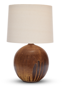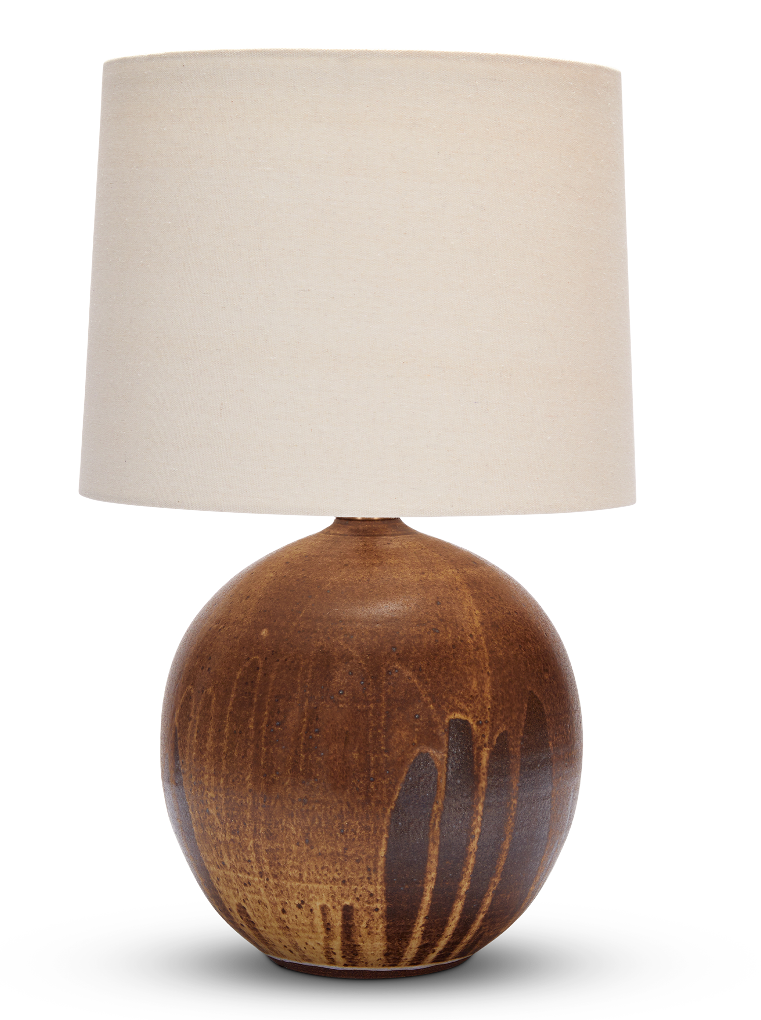 A classic lamp form, this large orb lamp is an elegant approach to a beloved lighting shape. Handmade in California with an oatmeal linen shade/diffuser and twisted brown cloth cord. Shape, size, and finish may vary slightly with each edition due to the unpredictable nature of studio pottery.
