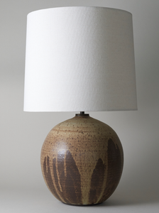 The Orb lamp is a timeless form - an elegant approach to a classic lighting shape. Finished in a refined rich brown and tan glaze. Handmade in California with an oatmeal linen shade/diffuser and twisted brown cloth cord. Exact shape, size, and finish will vary slightly with each edition due to the unpredictable nature of studio pottery.