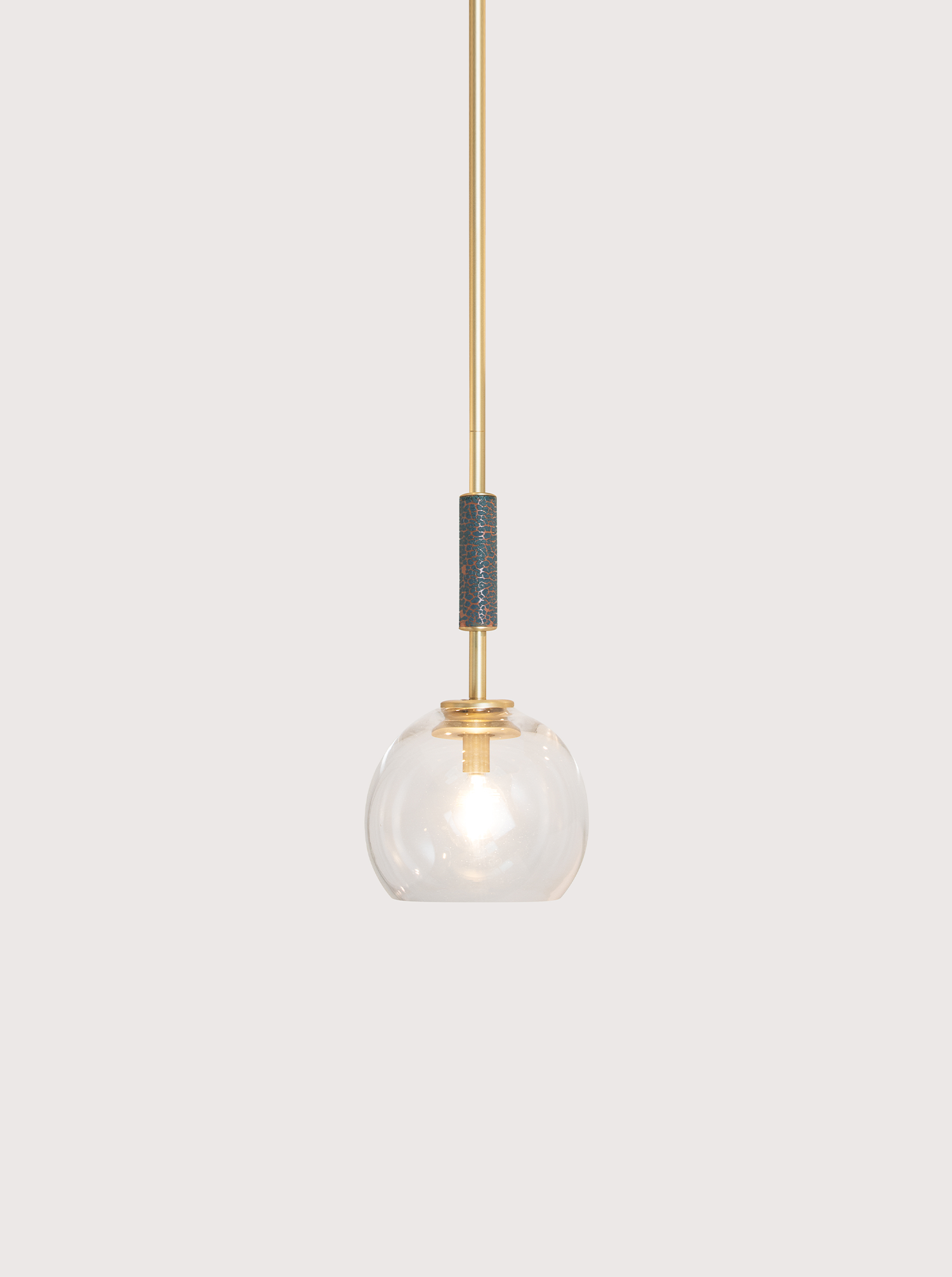 The Lawrence Pendant is inspired by the old knob and tube wiring in homes in the early 20th century. In the similar fashion that live wires were insulated by porcelain tubes, the Lawrence is wrapped in slip cast terracotta that has been glazed for a touch of color and playfulness. The pendant is completed with hand-blown glass and brass construction.