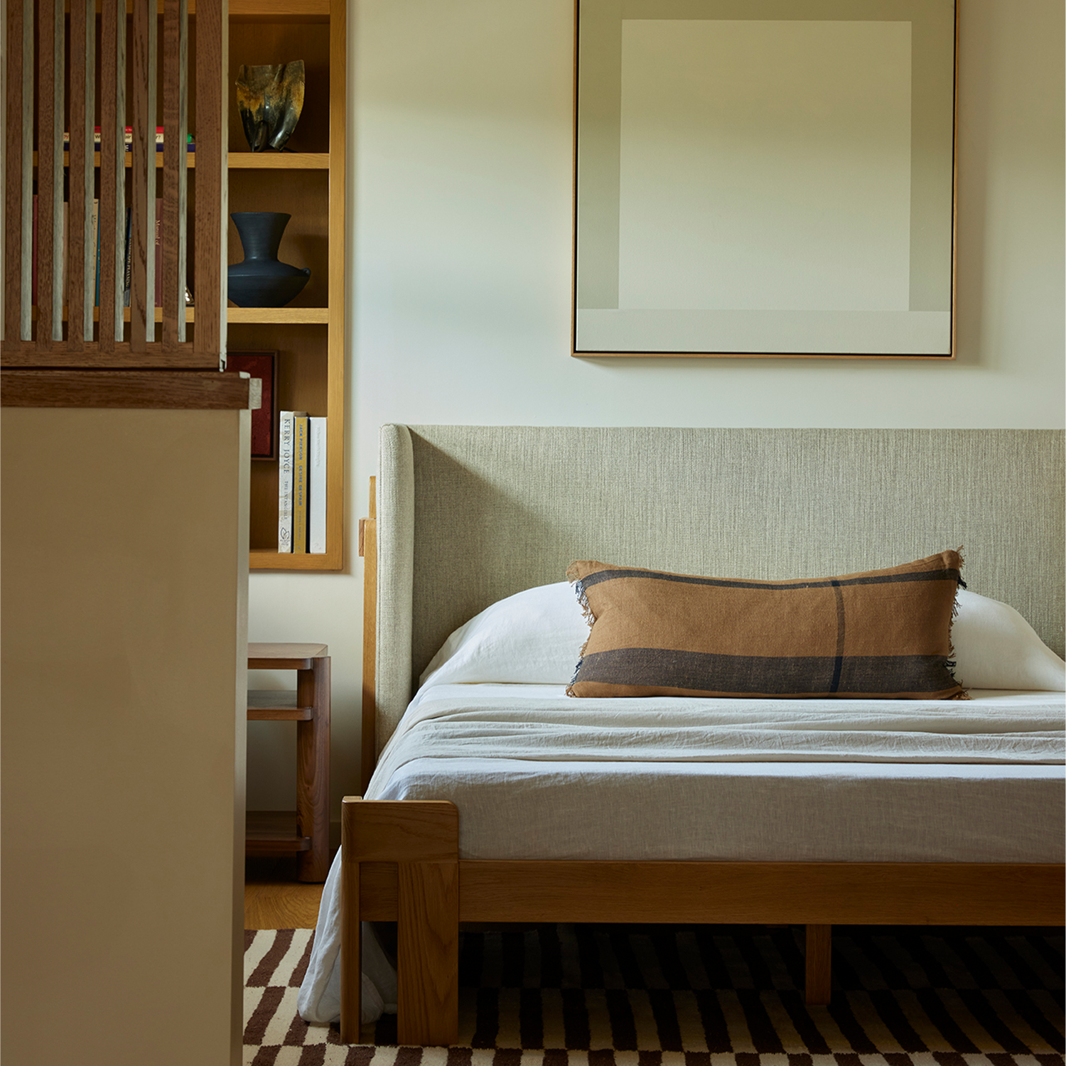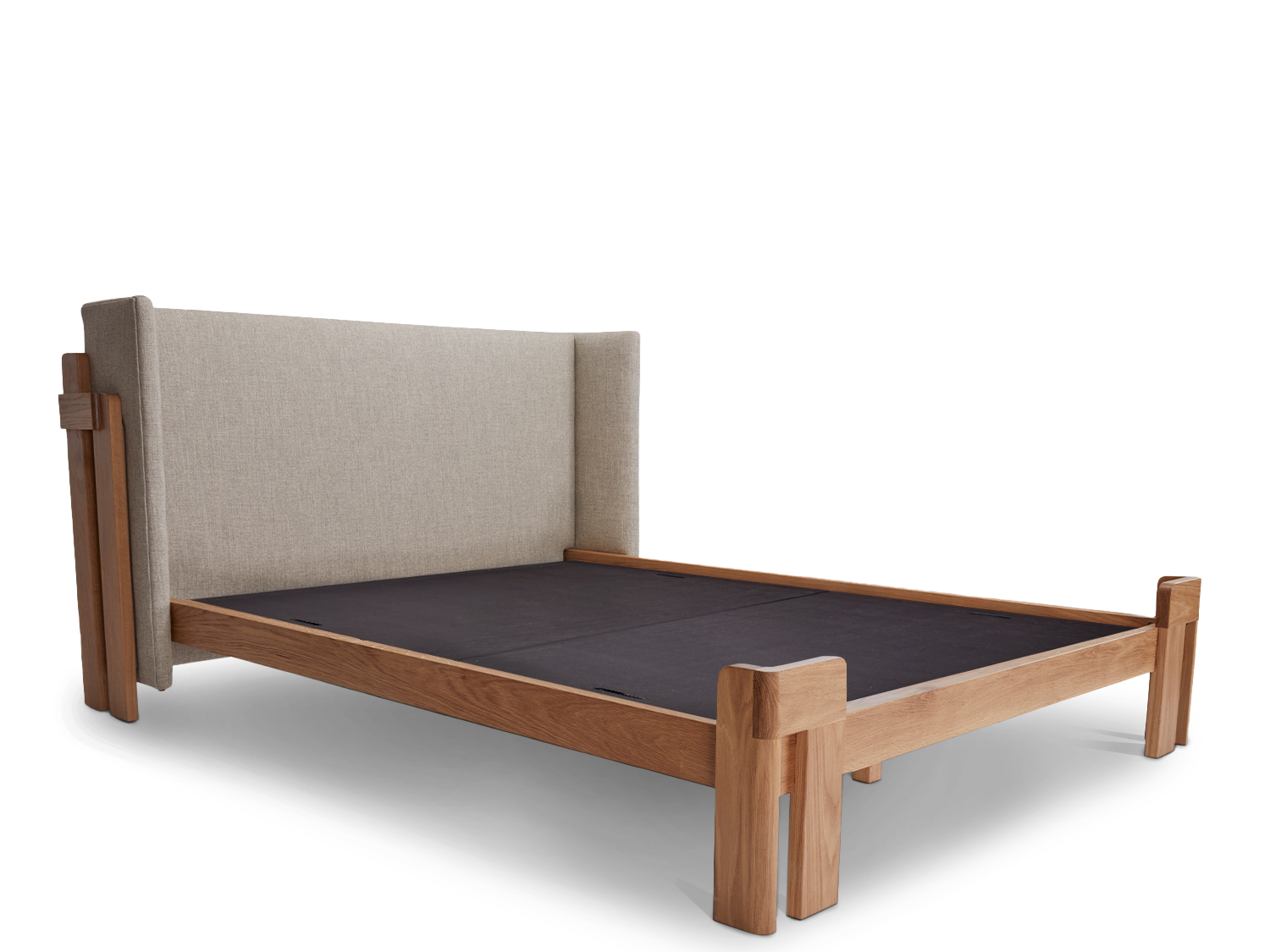 The Carlisle Bed's thoughtful joinery and spacing highlight the variety of details on the solid hardwood construction and upholstered headboard.