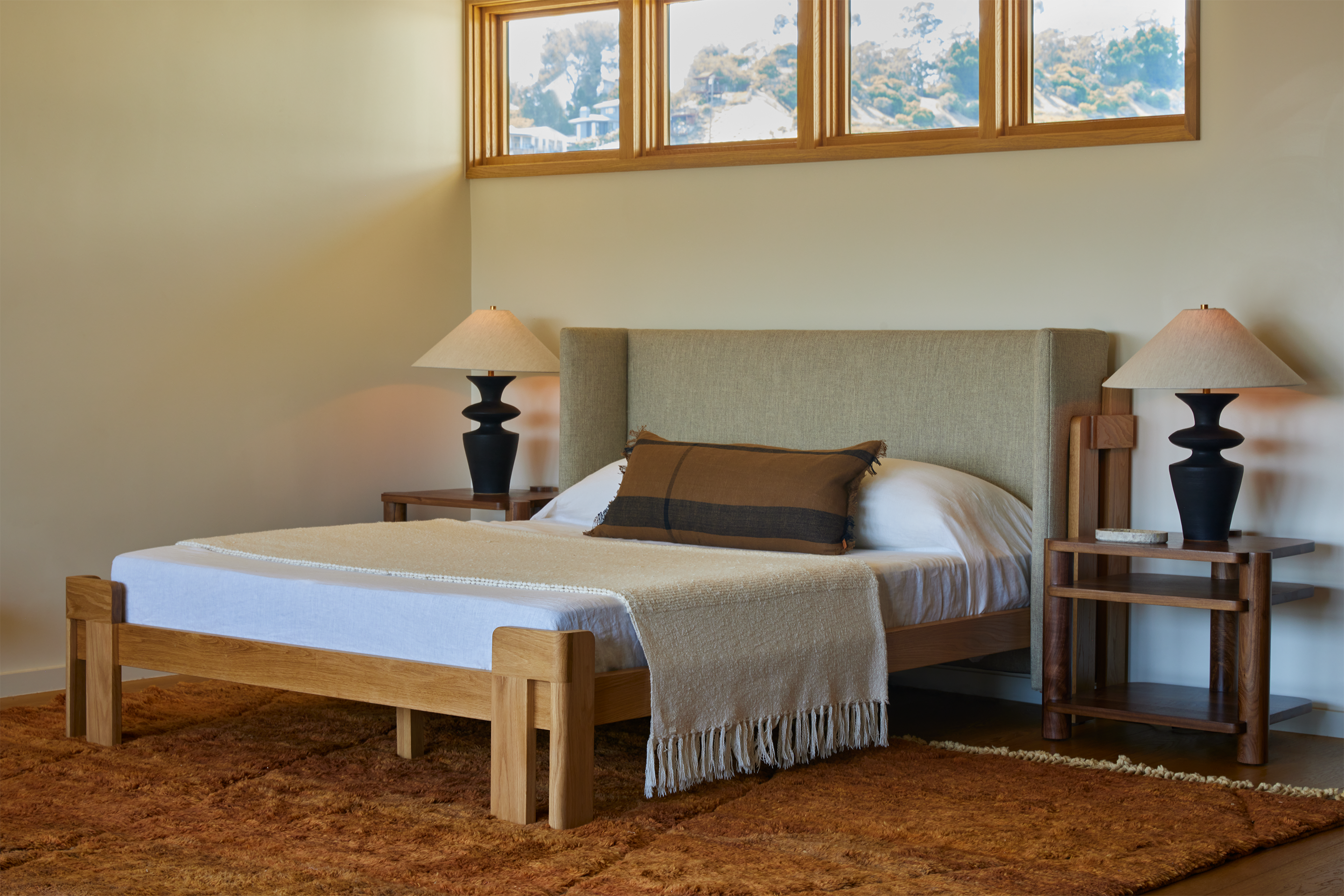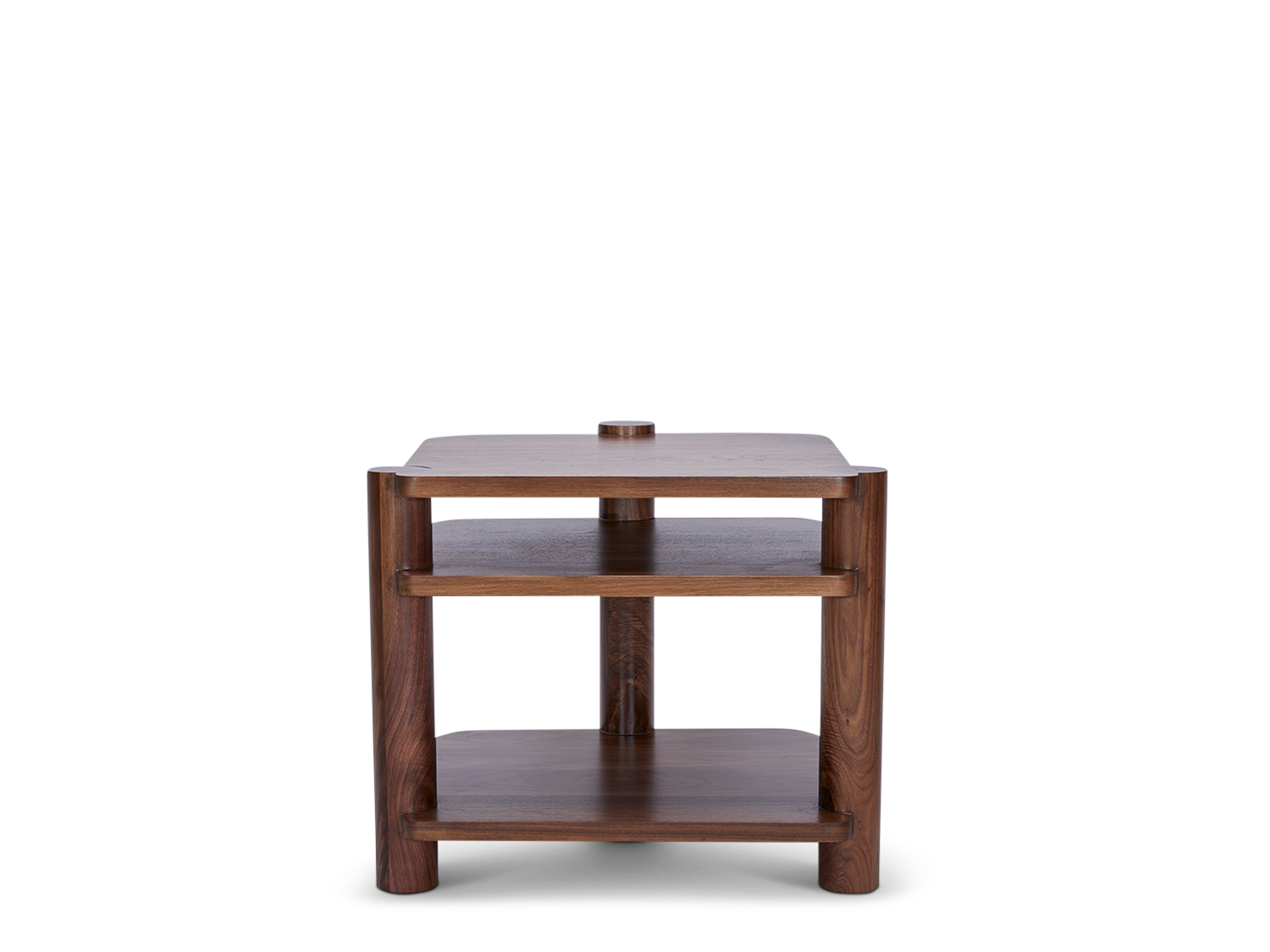 The Jalama End Table pairs sturdy hardwood dowels with cascading selves that play with various soft corners.