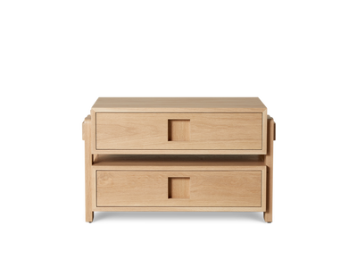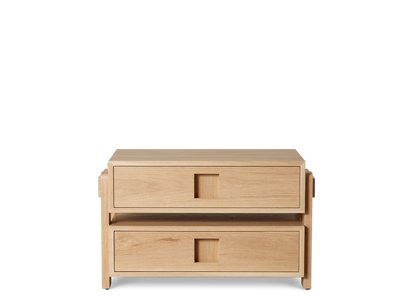 The Rincon Nightstand utilizes precise joinery and thoughtful spacing to suspend two generously sized drawers between hardwood exterior legs.