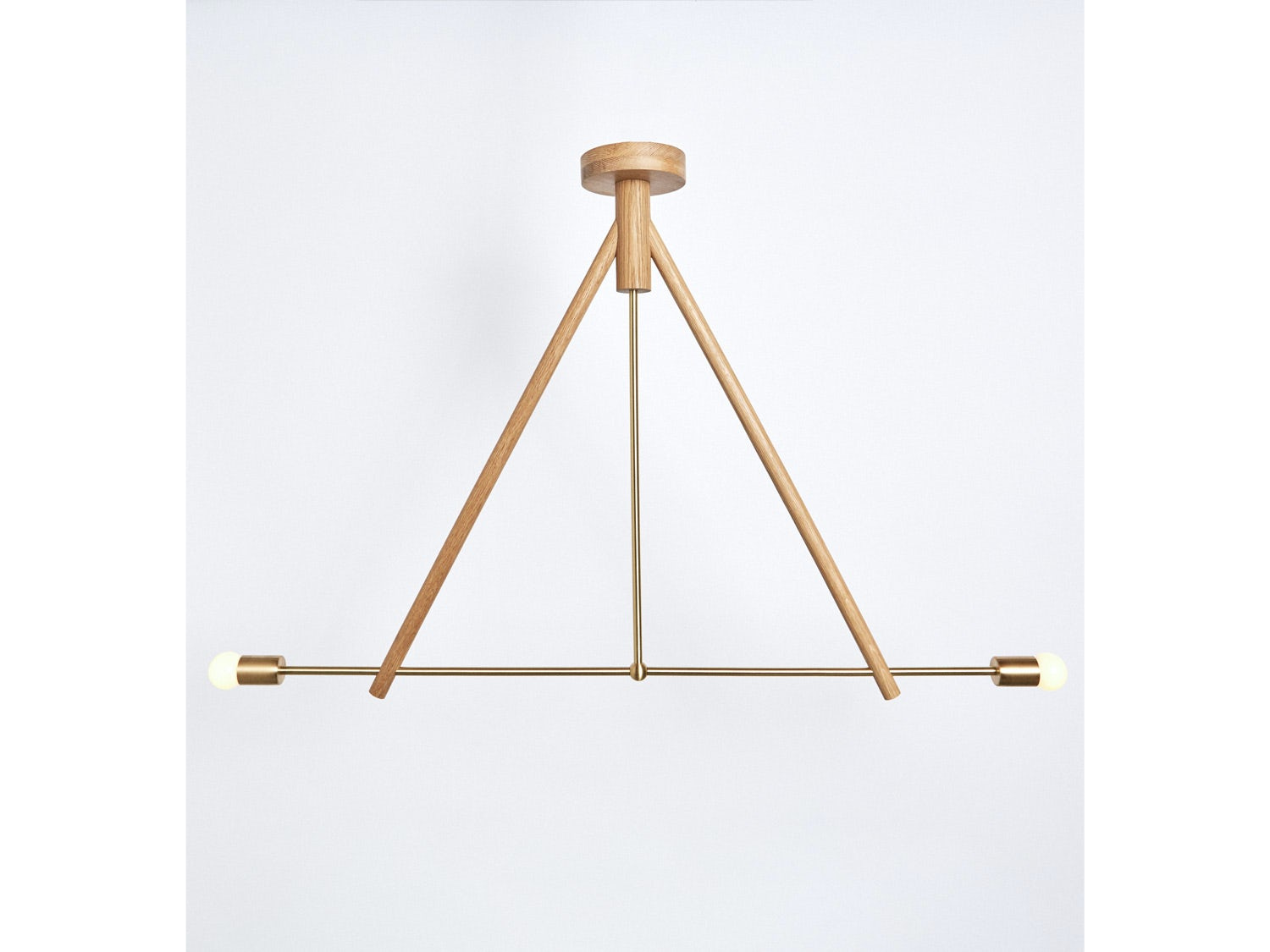 The Lodge Chandelier II explores the concept of wooden framework in contrast with metal structure. Two turned-wooden forms support a delicate system of metal tubing, and a duo of radiant porcelain bulbs. Custom dimensions available.