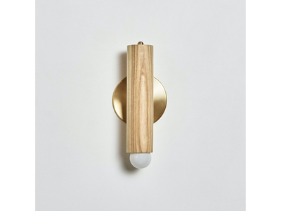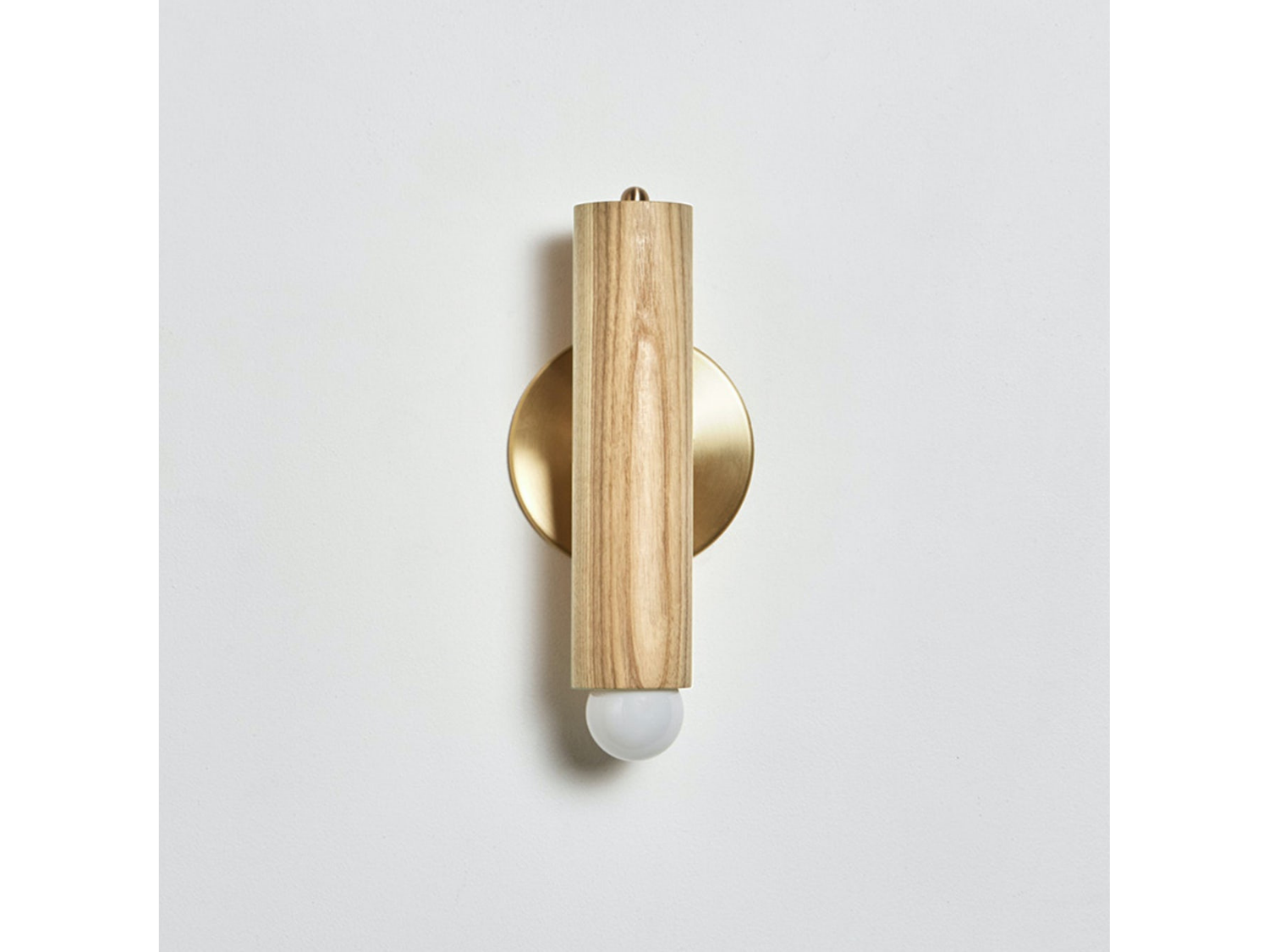 The Lodge Sconce features a singular wooden column mounted on a circular metal backplate. The adaptable fixture can pivot 360 degrees for soft directional light, dimmable by an on-fixture knob.