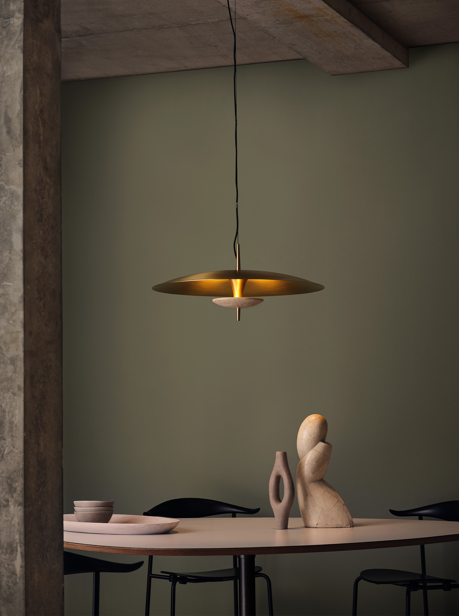 Inspired by the cosmos and the effect of a total eclipse, the Luna 350 Pendant features a 350mm hand-spun dish that reflects light, casting a warm, outward halo of illumination.