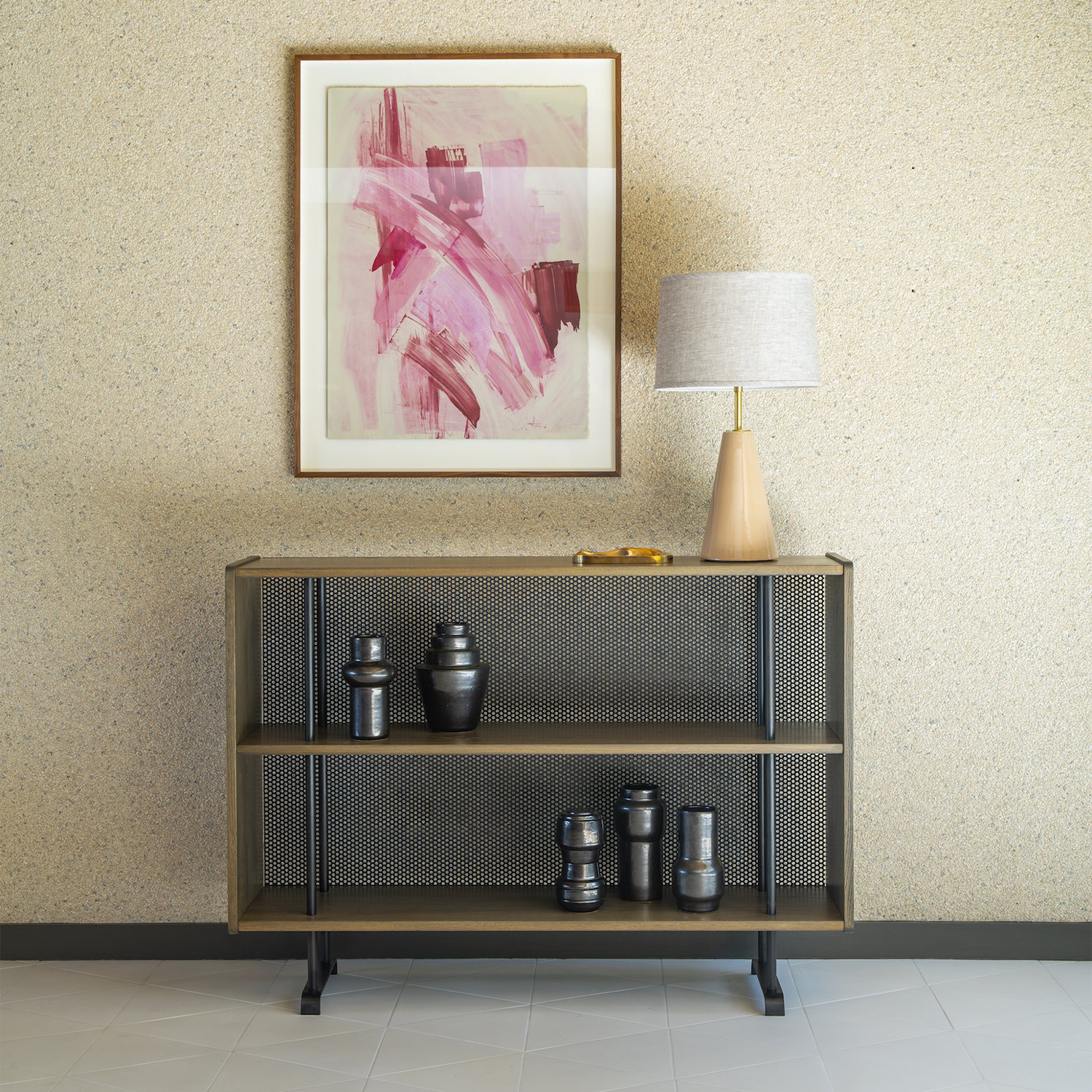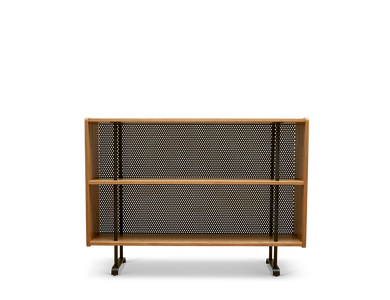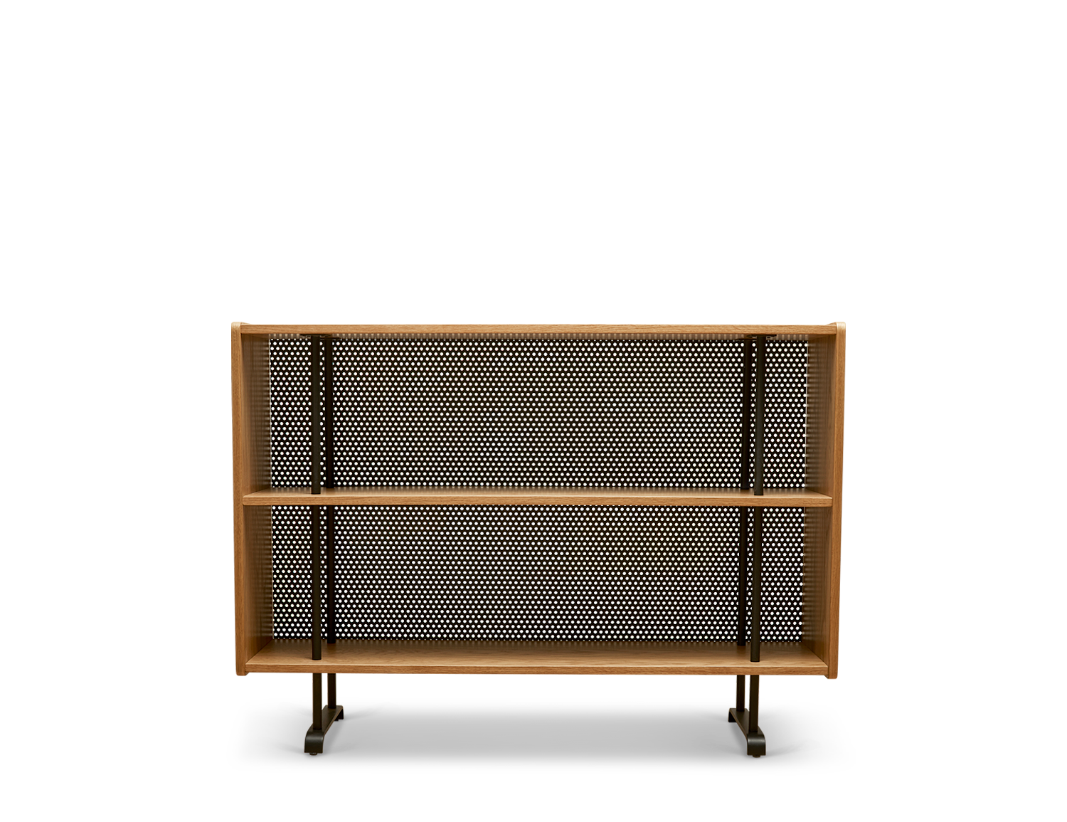 The Maker's Bookcase is a freestanding bookcase made of American walnut or white oak. The frame rests on a blackened steel base and features two shelves and a perforated steel detail on the back.