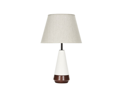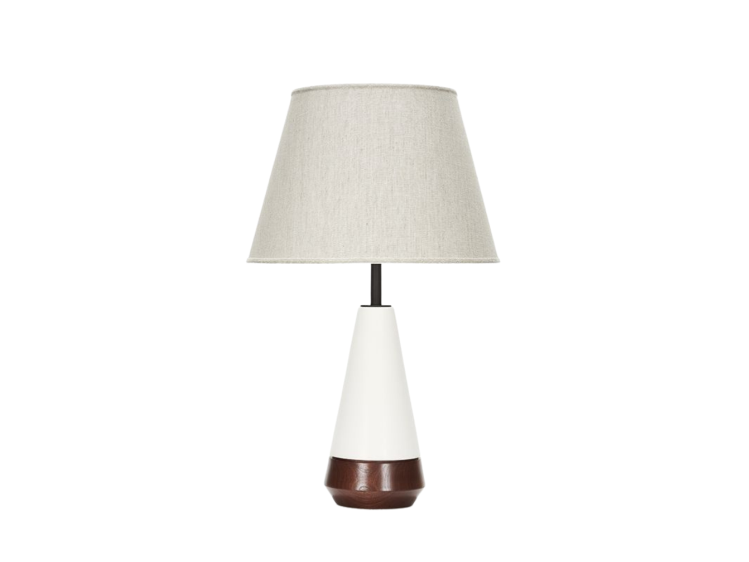 Handcrafted stoneware lamp made in upstate New York by Stone and Sawyer. Please contact showroom for custom glaze options. Images feature satin brass metal, walnut wood, and natural linen shade. Please review lead times and shipping notes in Product Details prior to purchasing.