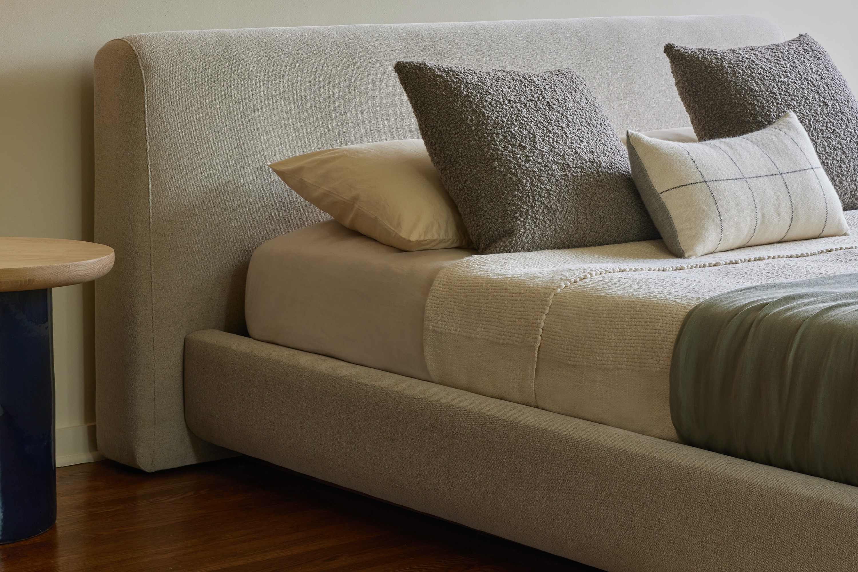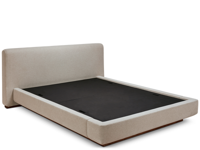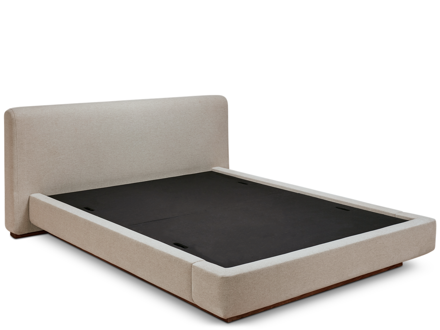 The Mesa Bed is fully upholstered and features a deeply inset base constructed from American Walnut or White Oak. With its soft curves and recessed base it has a suggestion of levitation.