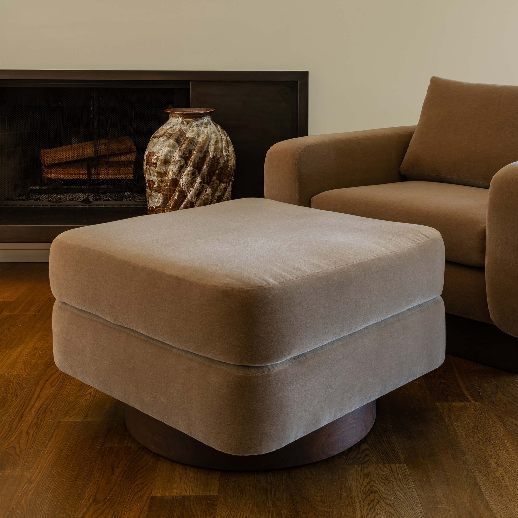 The Mesa Ottoman is fully upholstered and features a walnut or oak inset base. Available with the Mesa Lounge Chair.