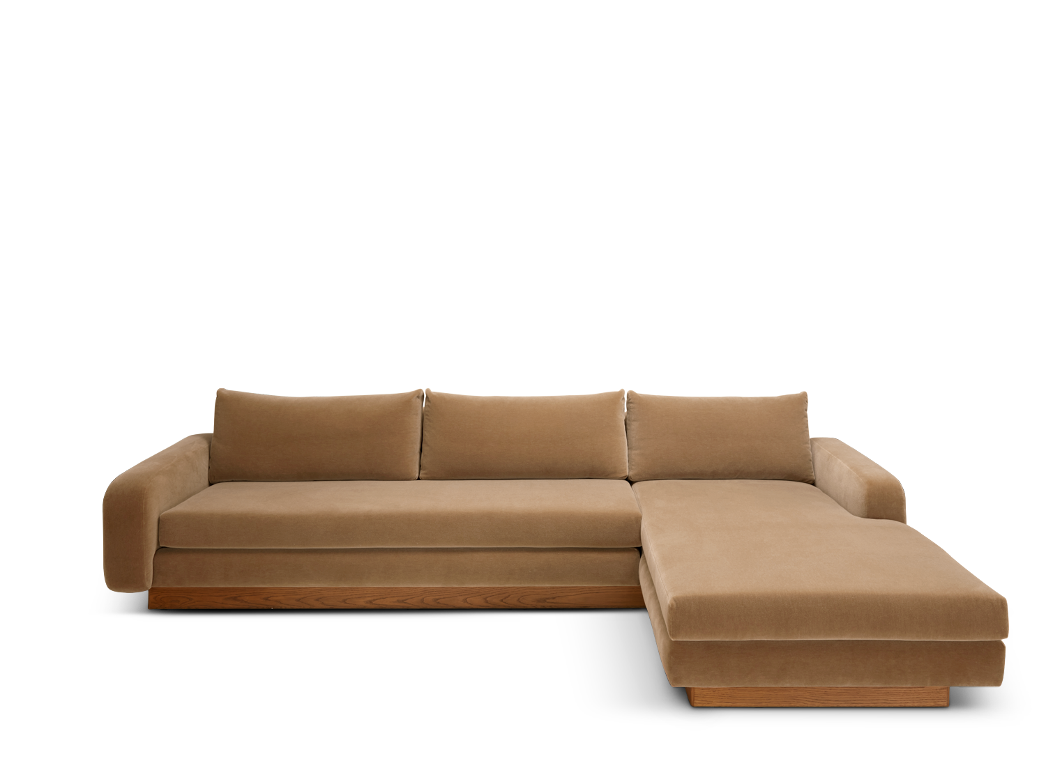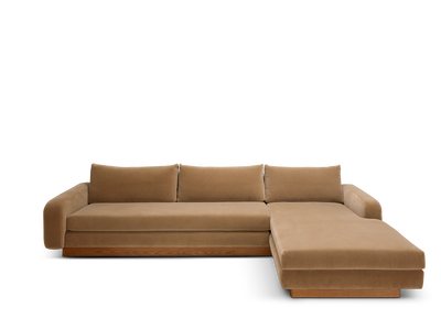 The Mesa Sectional is fully upholstered and features a walnut or oak plinth base. Also available as an L Shaped Sectional or a Sofa.