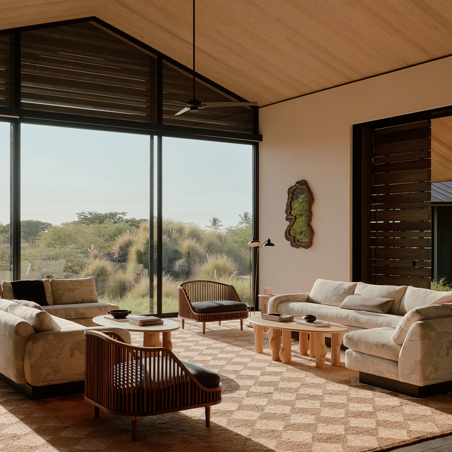 The Mesa Sectional is fully upholstered and features a walnut or oak plinth base. Also available as a Sectional with Chaise or a Sofa.