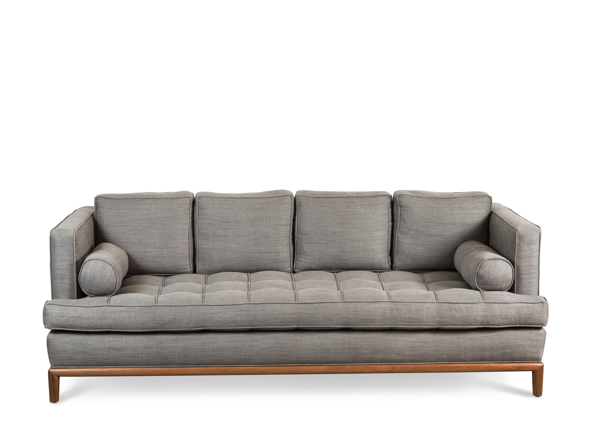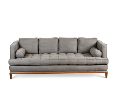 The Montebello Sofa is a tuxedo-style sofa with a button-tufted seat and wooden base. Comes with either 3 or 4 down-wrapped cushions and 2 bolster pillows.