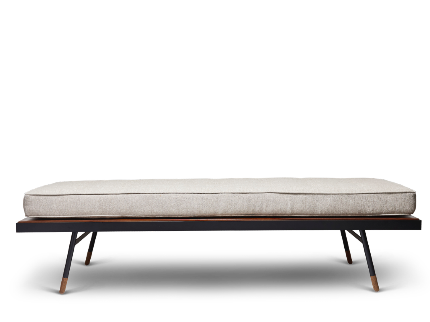 The Montrose Daybed has a steel frame, solid teak slatted insert, and a loose tufted cushion. Suitable for indoor and outdoor use, please specify when ordering.