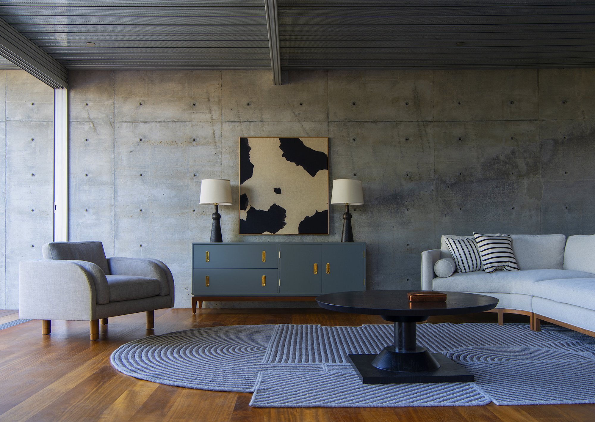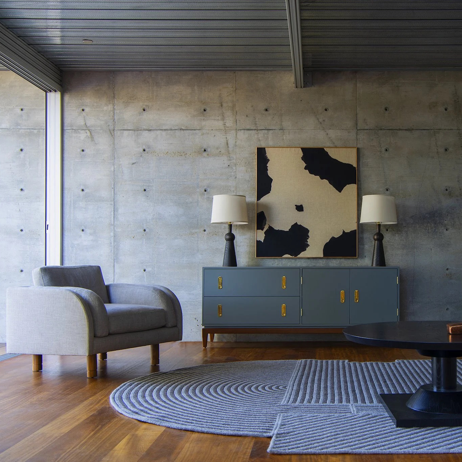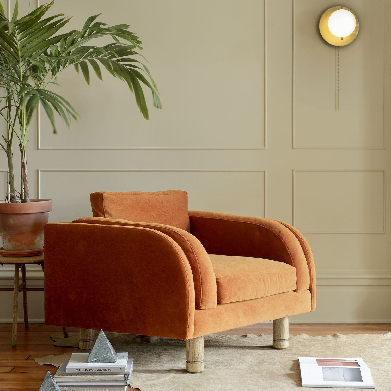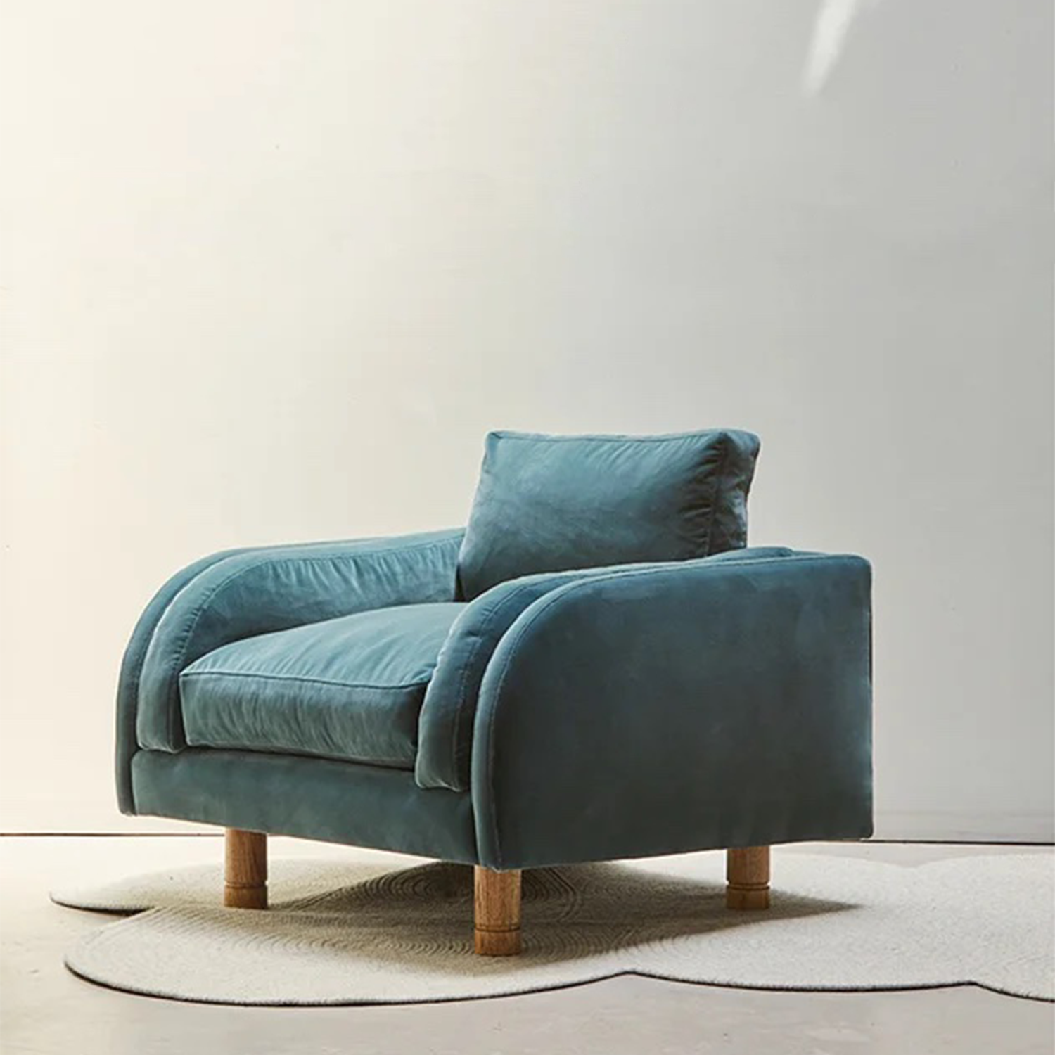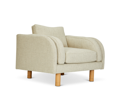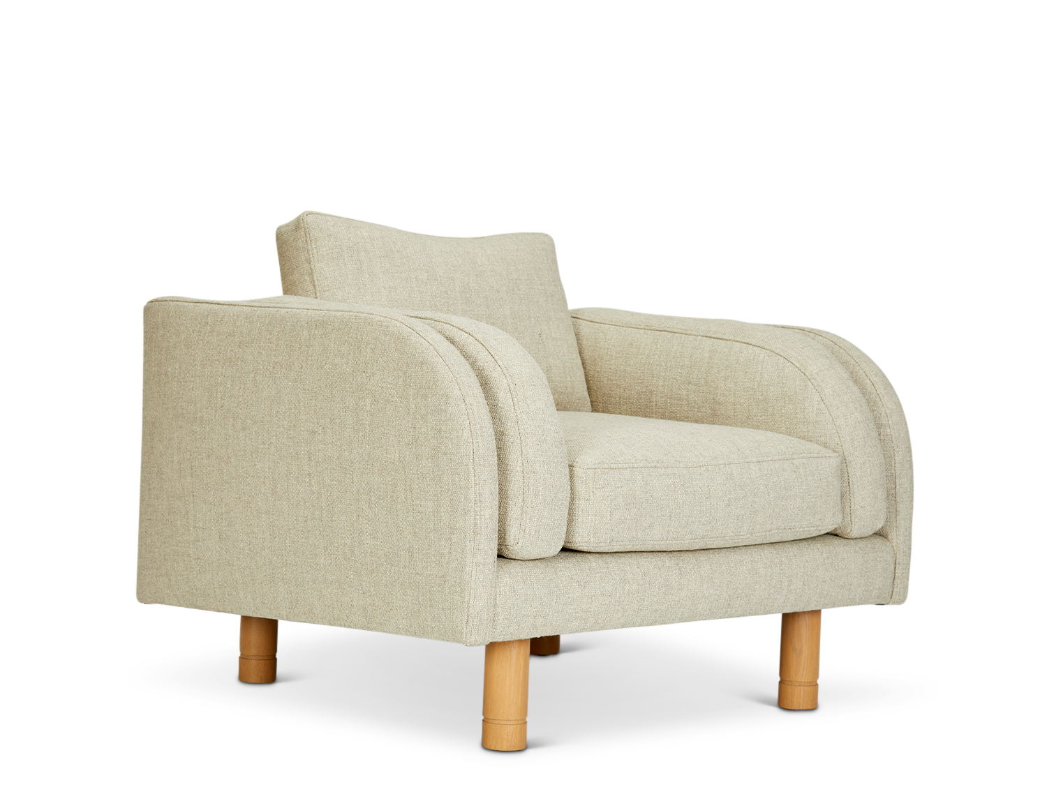 The Moreno Chair sits low and deep with Italian-inspired curved arms. The chair features loose seat and back cushions and two side cushions that mimic the curvature of the arms. The legs have an incised detail and are made of solid American walnut or white oak.