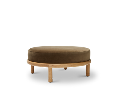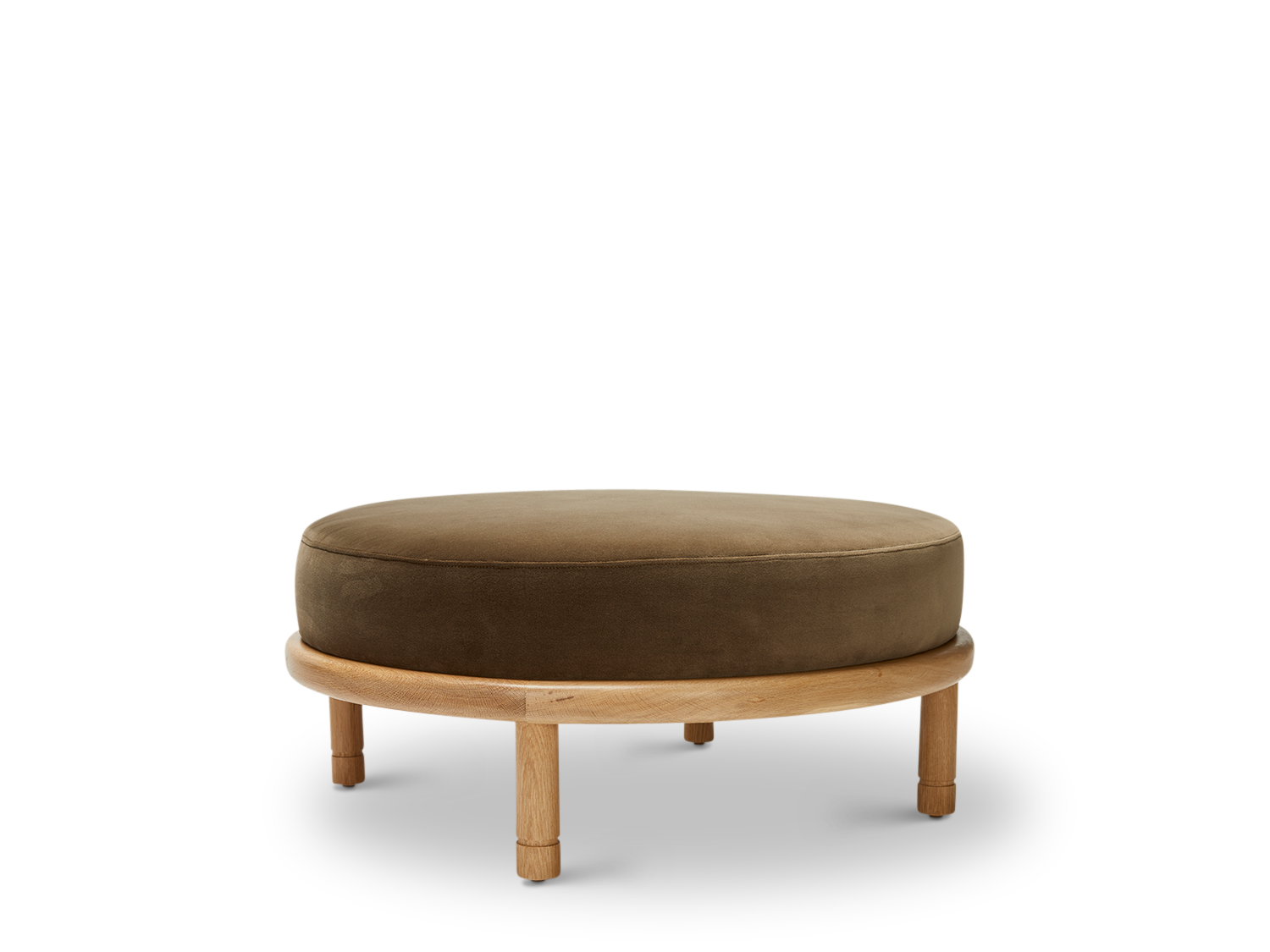 The Moreno Ottoman features a round solid wood base with four cylindrical legs and an upholstered top. Available in American walnut or white oak.