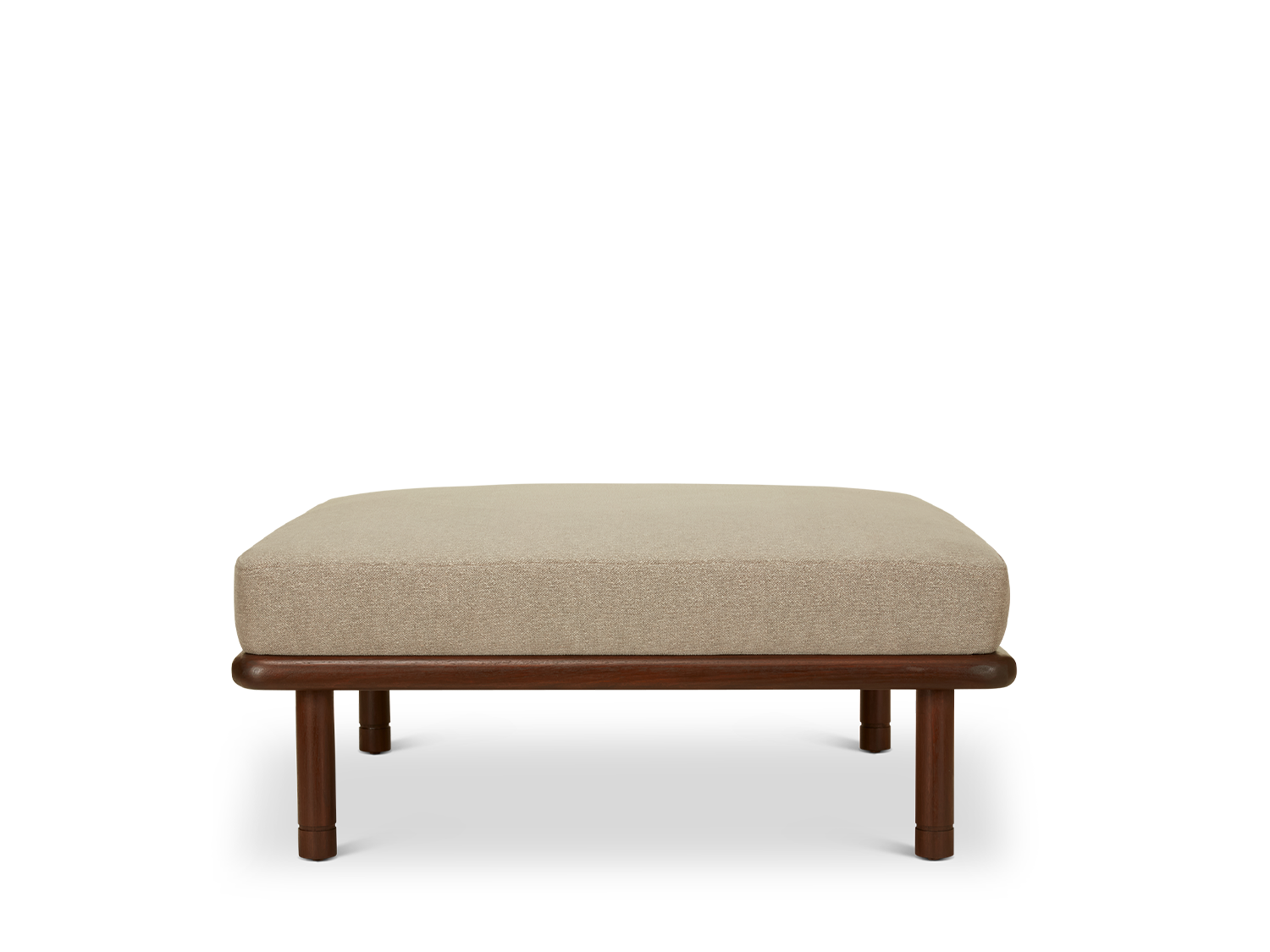 The Moreno Ottoman Square features a solid wood base with four cylindrical legs and an upholstered top. Available in American walnut or white oak.
