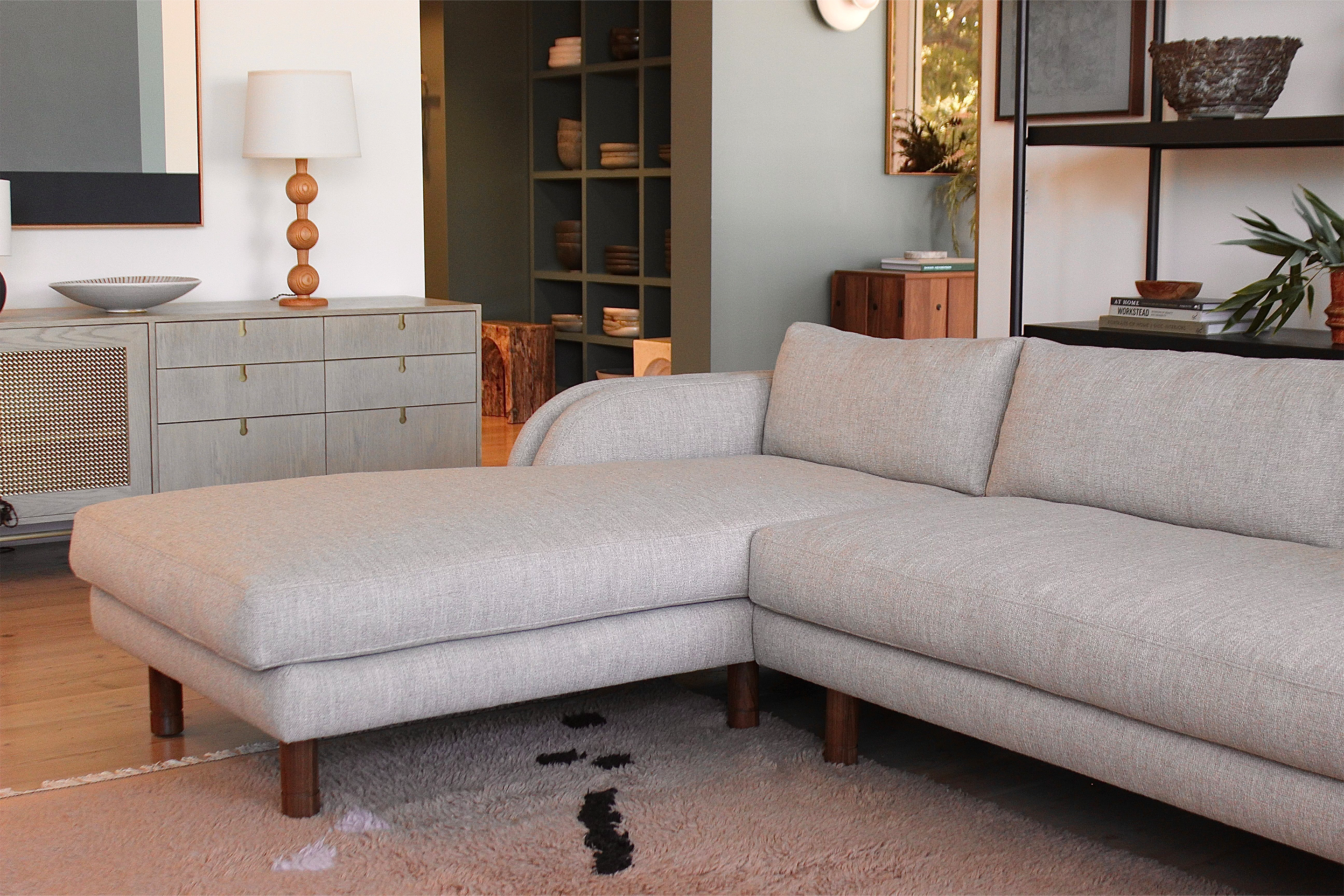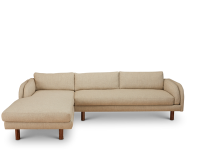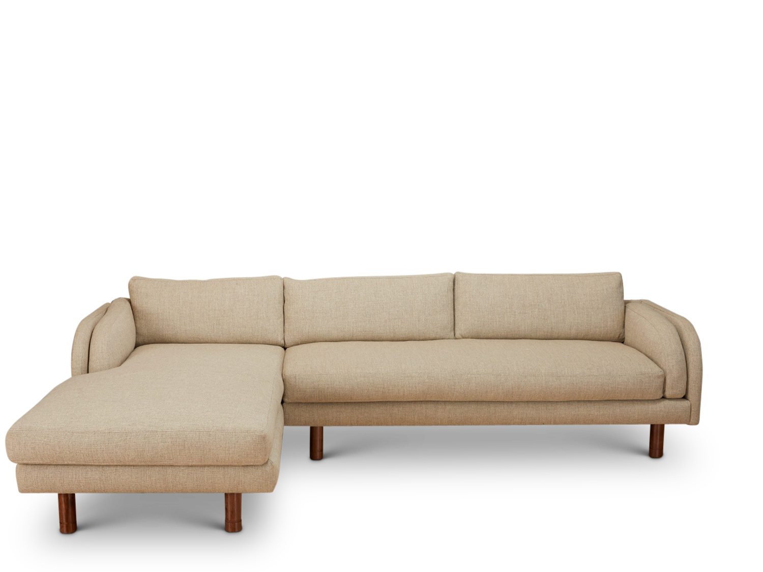 The 2 piece Moreno Sectional sits deep and spacious with a beautifully curved silhouette. This sectional consists of a bench sofa and a generous chaise which can be specified for either the left or the right side. The solid wood pole legs have an incised detail and can be built using oak or walnut. Also available as a sofa.