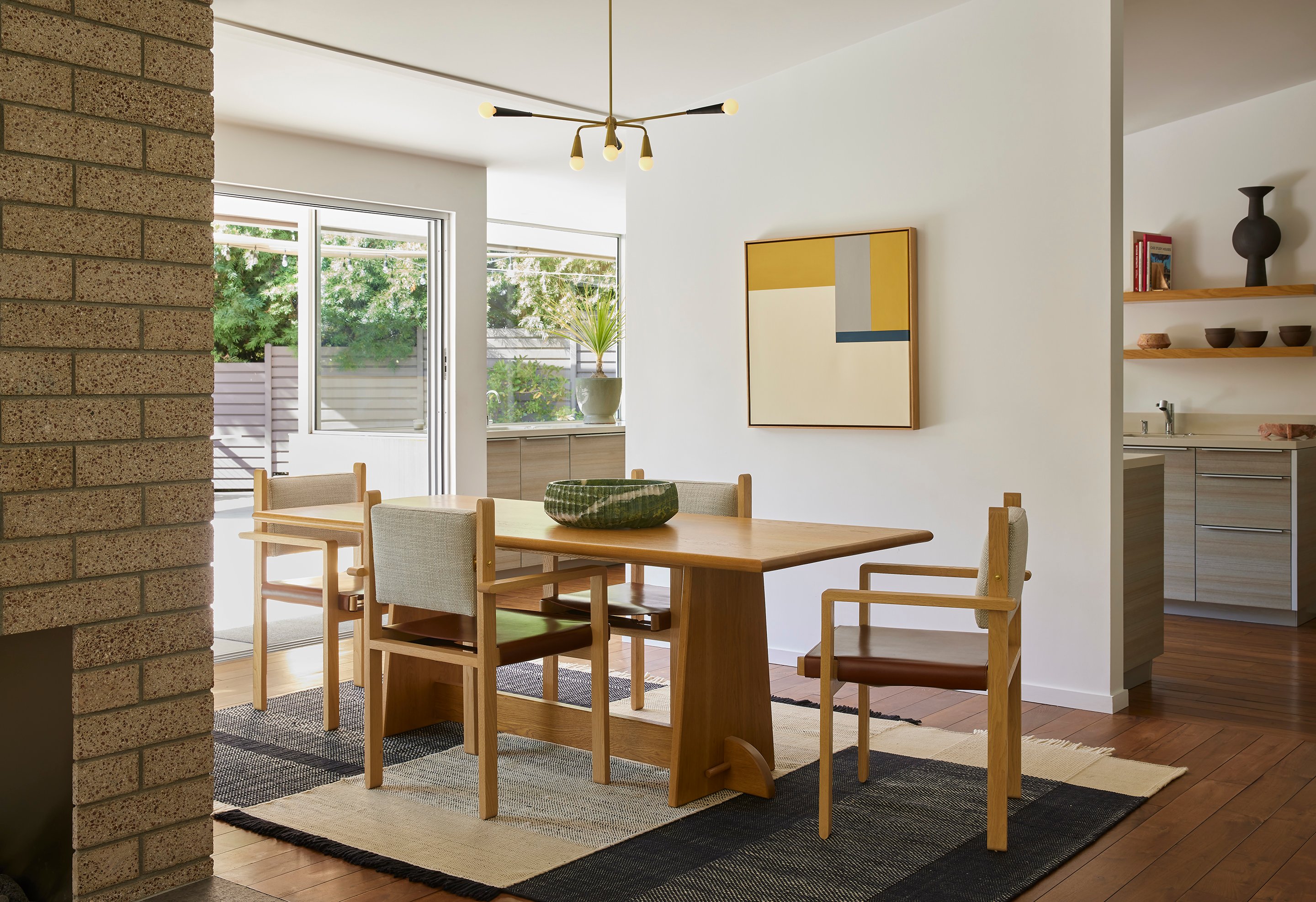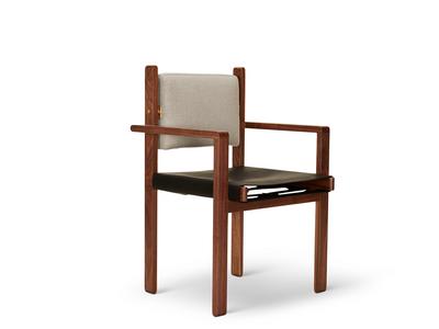 The Morro Dining Arm Chair is made from a solid American walnut or white oak frame, with the option for an upholstered back cushion & morro leather sling seat or an upholstered back cushion & upholstered seat.