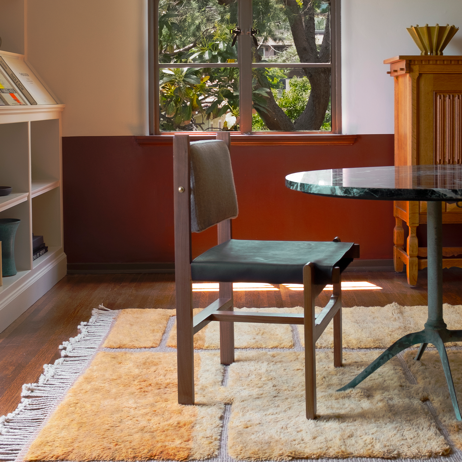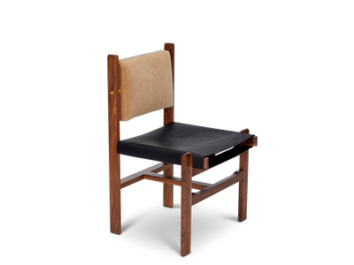 The Morro Dining Side Chair is made from a solid American walnut or white oak frame and features an upholstered back cushion with a Morro leather sling seat. Also available with an upholstered back cushion and upholstered seat.