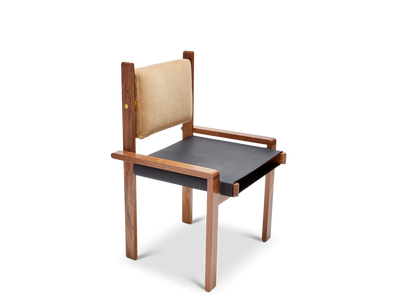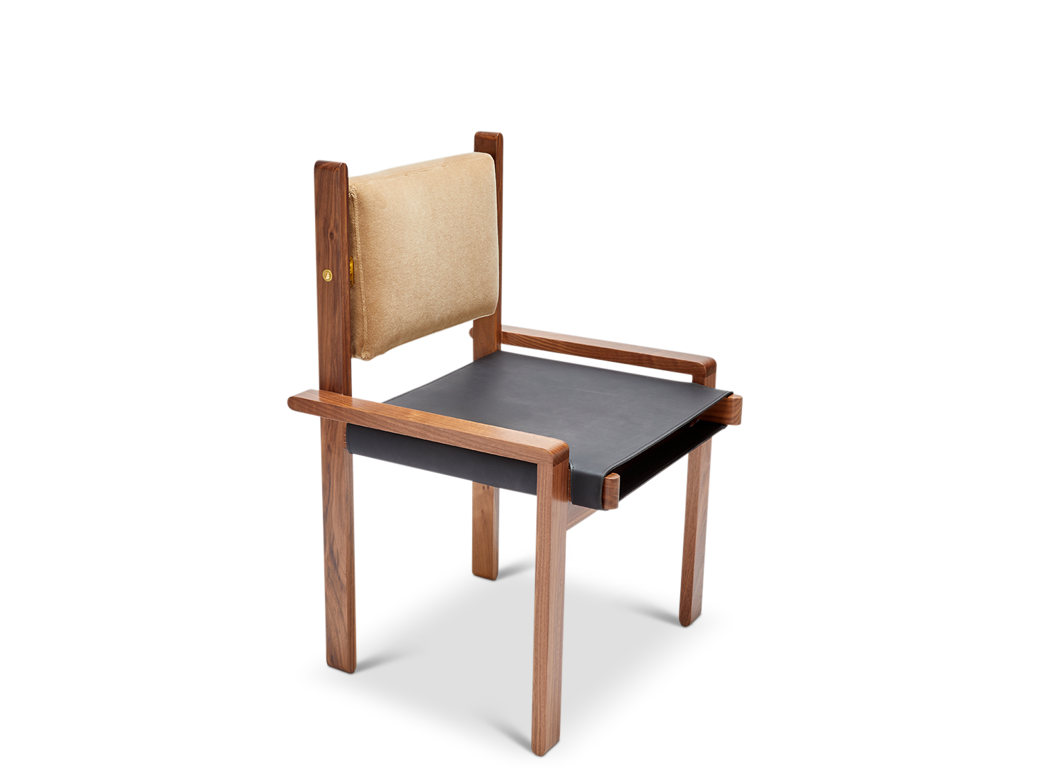 The Morro Low Arm Dining Chair is made from a solid American walnut or white oak frame, with the option for an upholstered back cushion & morro leather sling seat or an upholstered back cushion & upholstered seat. Inspired by the articulated connections of Bauhaus Architects/Designers.