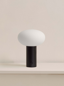 An elemental table lamp that pairs an elliptical, hand-blown glass diffuser with a weighted steel base. Available in a range of finishes, its base features an integrated dimmer but conceals the fixture’s bulb—so all that’s left to see is uninterrupted light.
