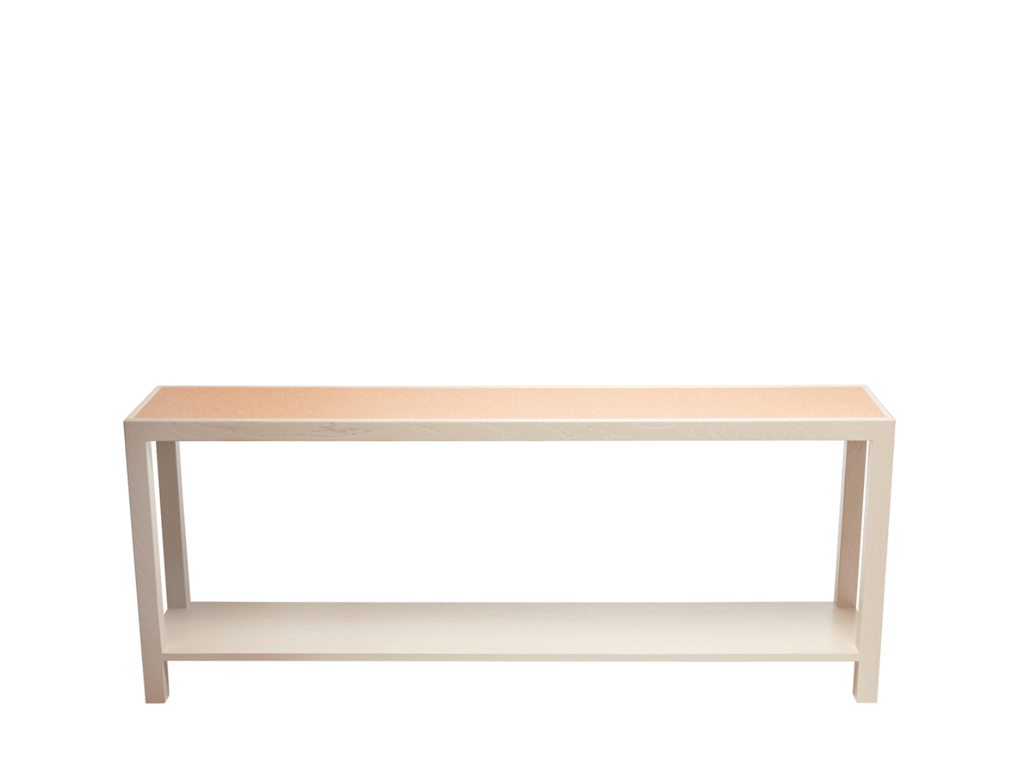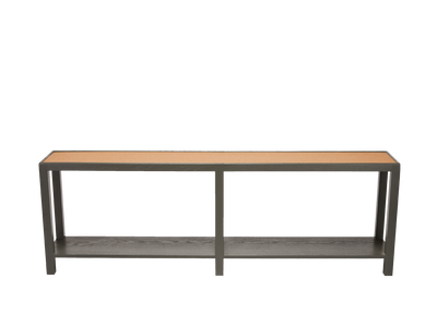 The Narrow Console is made of solid American walnut or white oak. Each console comes with a lower shelf and your choice of a cork or bronze mirror top. 72" has center legs.