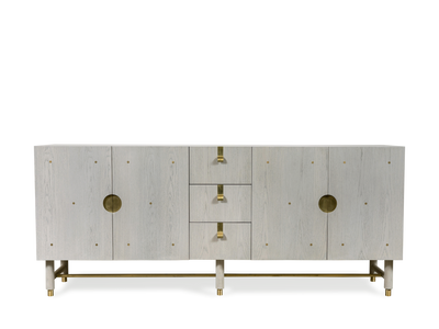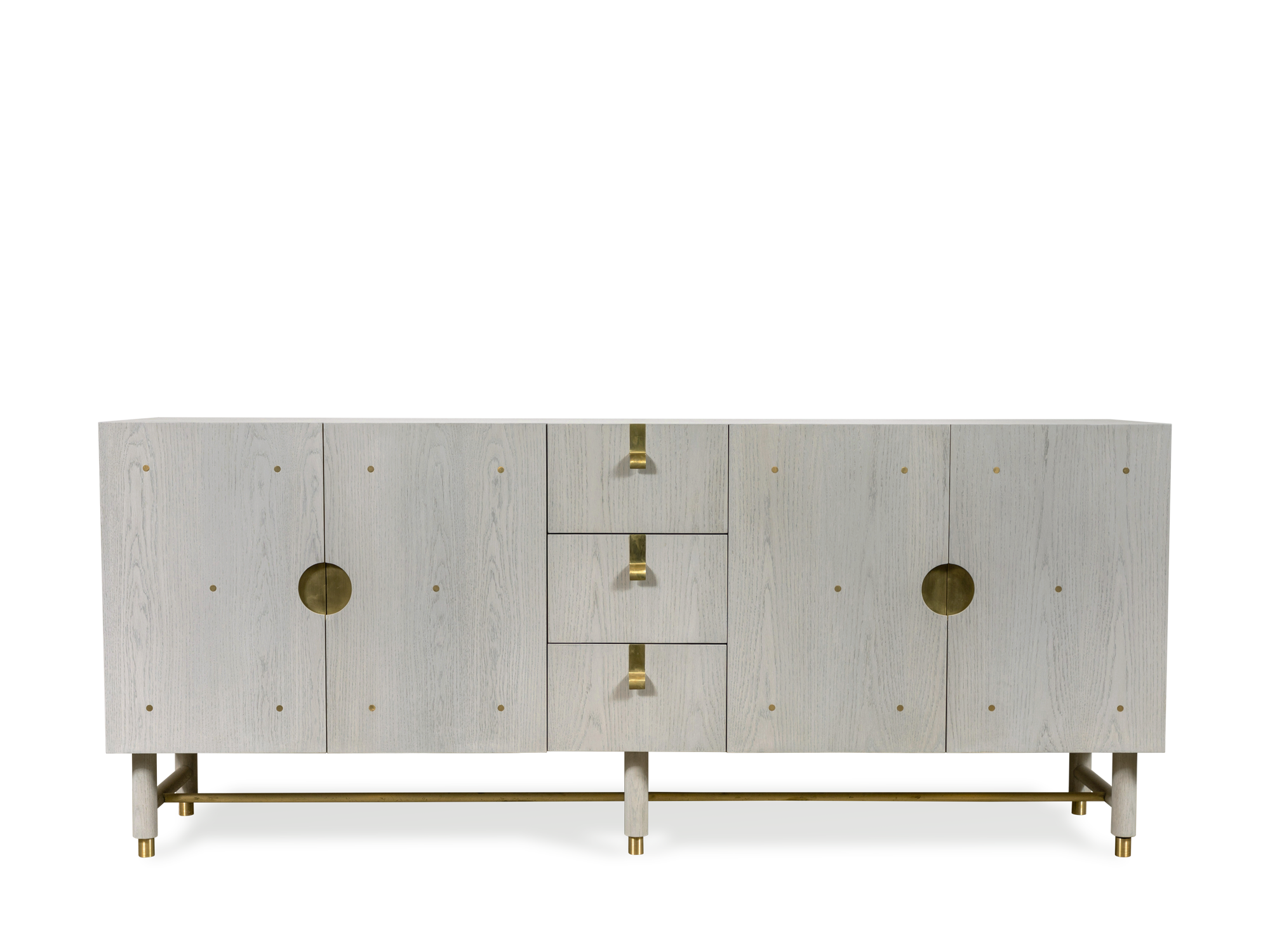 The Niguel Cabinet features three central drawers. On the left is a single compartment with one adjustable shelf. On the right, are two compartments, each with an adjustable shelf and one with a drawer. Details include leveling brass cap feet, a brass stretcher bar on the base, lacquered interior drawers, inset brass hardware, and inlaid brass circles on the doors.