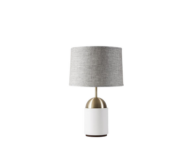 Handcrafted stoneware lamp made in upstate New York by Stone and Sawyer. Please contact showroom for custom glaze options. Images feature satin brass metal, walnut wood, and natural linen shade. Please review lead times and shipping notes in Product Details prior to purchasing.