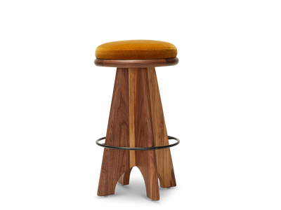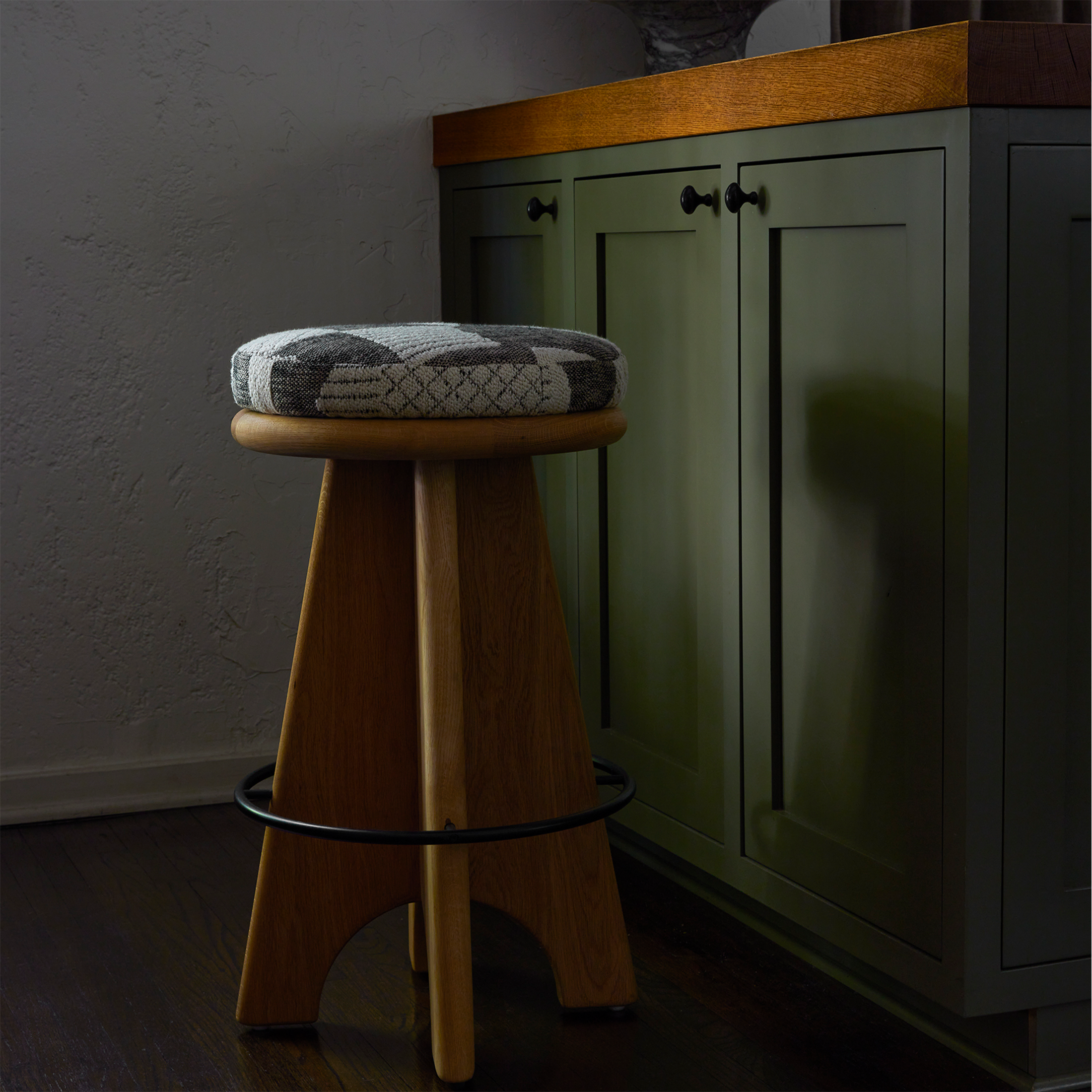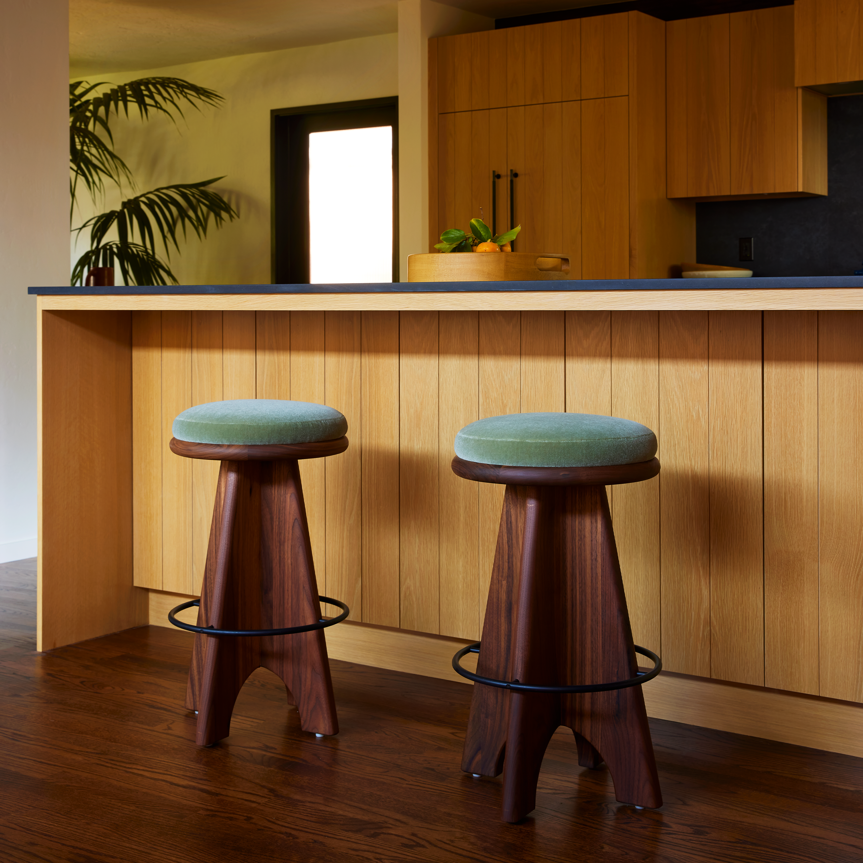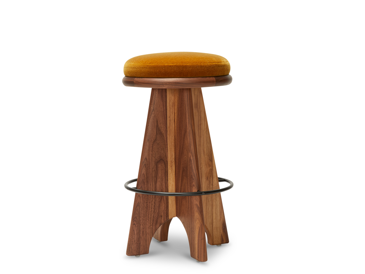 The Ojai Barstool features a sculptural wood base, powder coated metal footrest and an upholstered swivel seat.