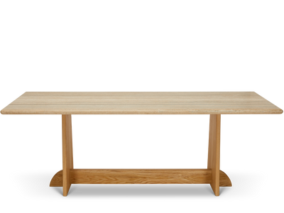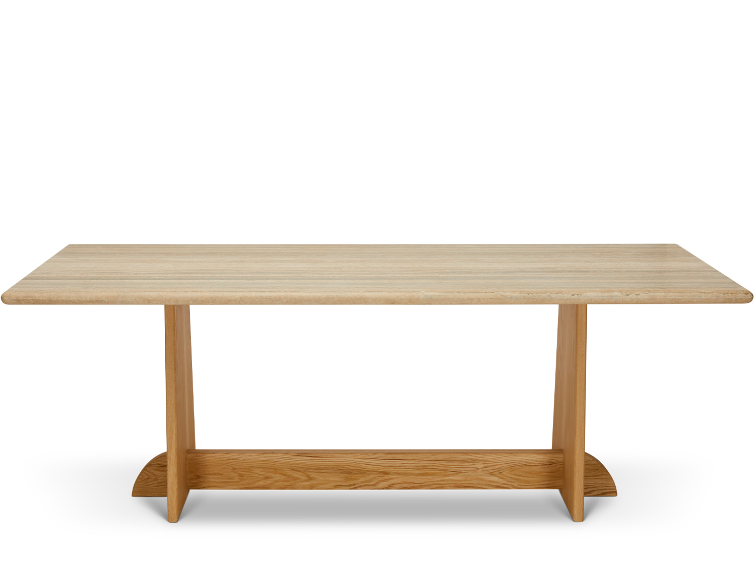 The Ojai Dining Table features a trestle base made of solid wood and a stone top. Available with a wood top.