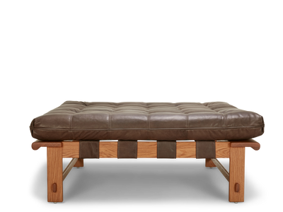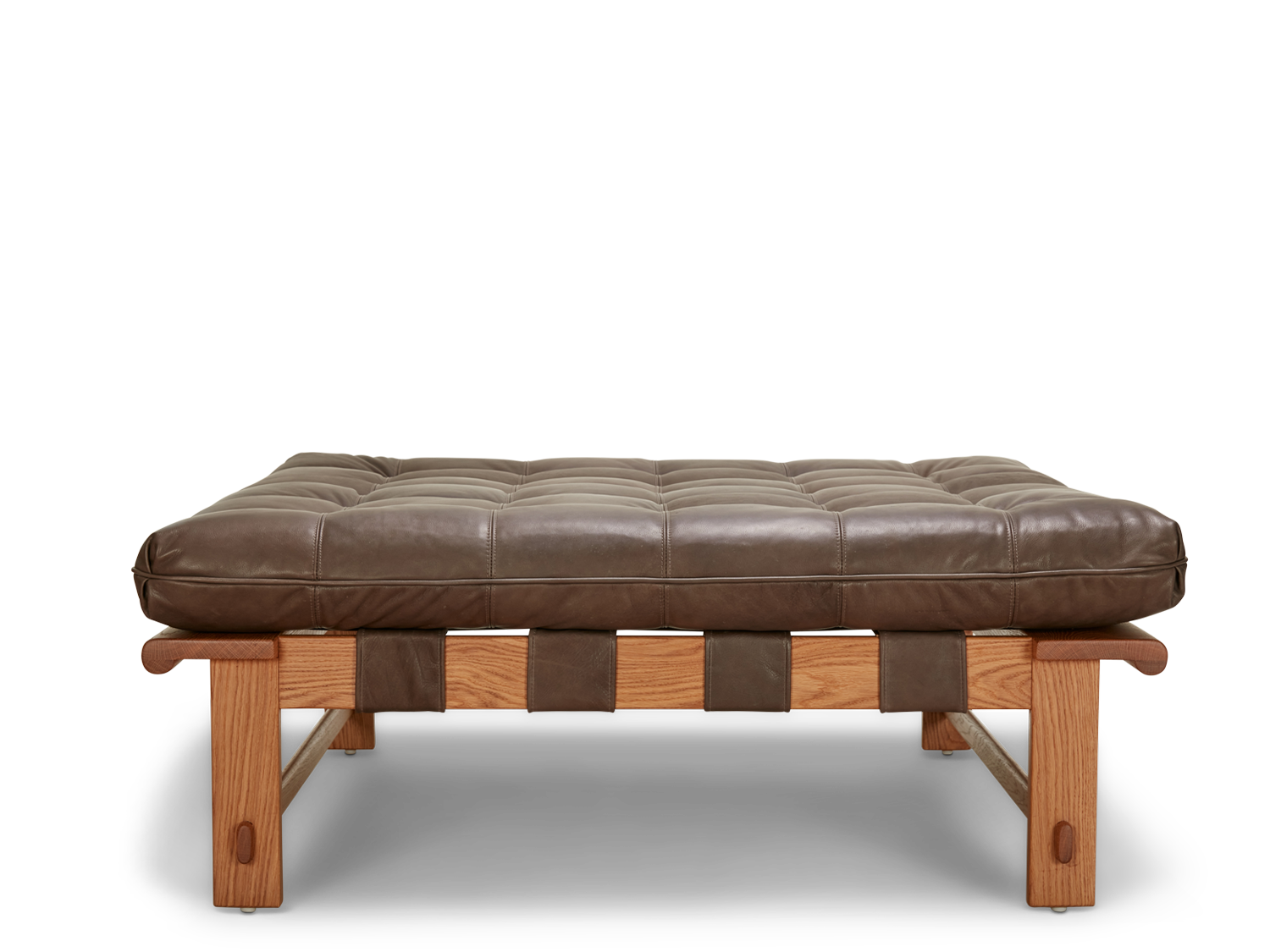 The Ojai Ottoman features a solid white oak or solid walnut base and a tufted leather cushion with leather straps.
