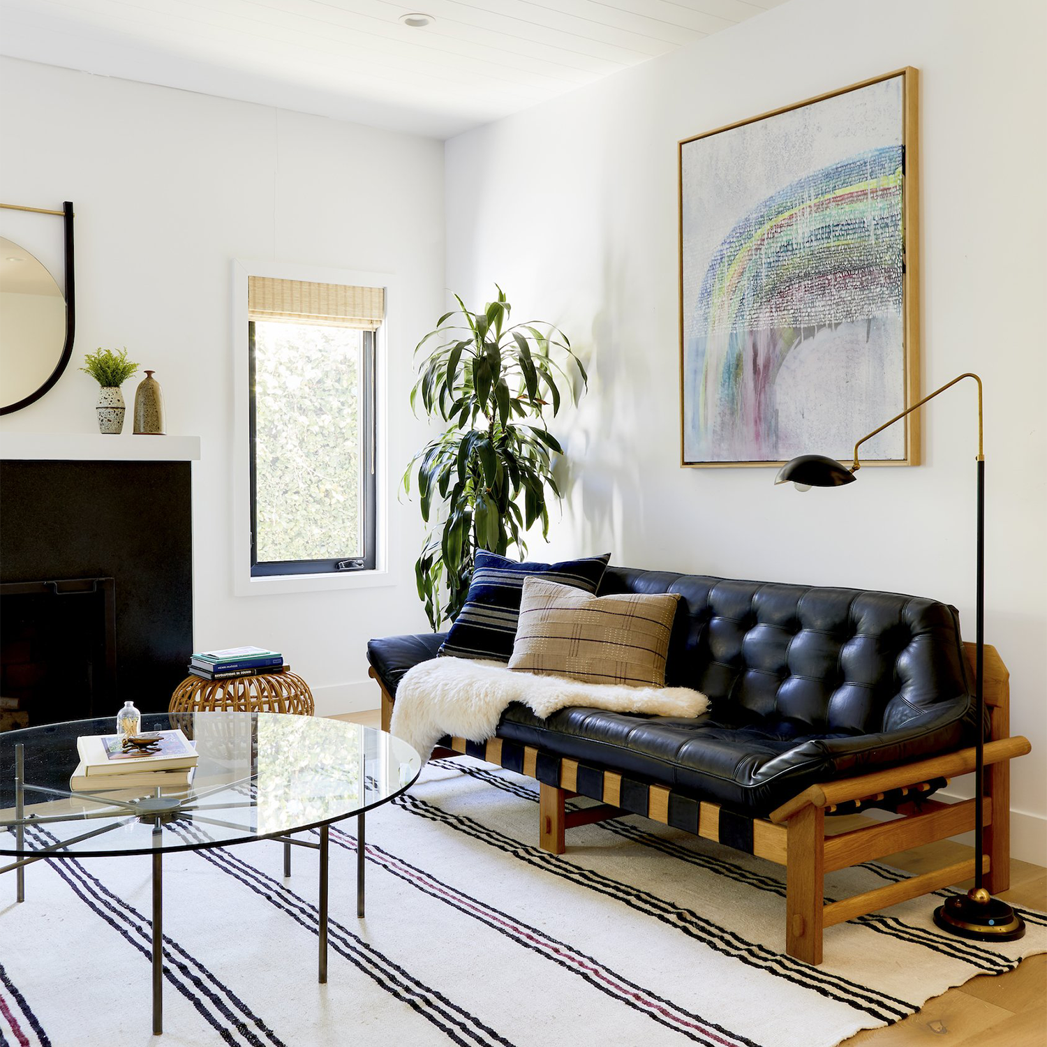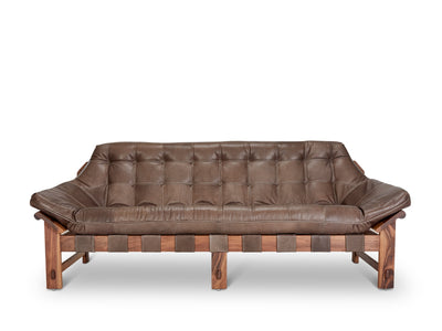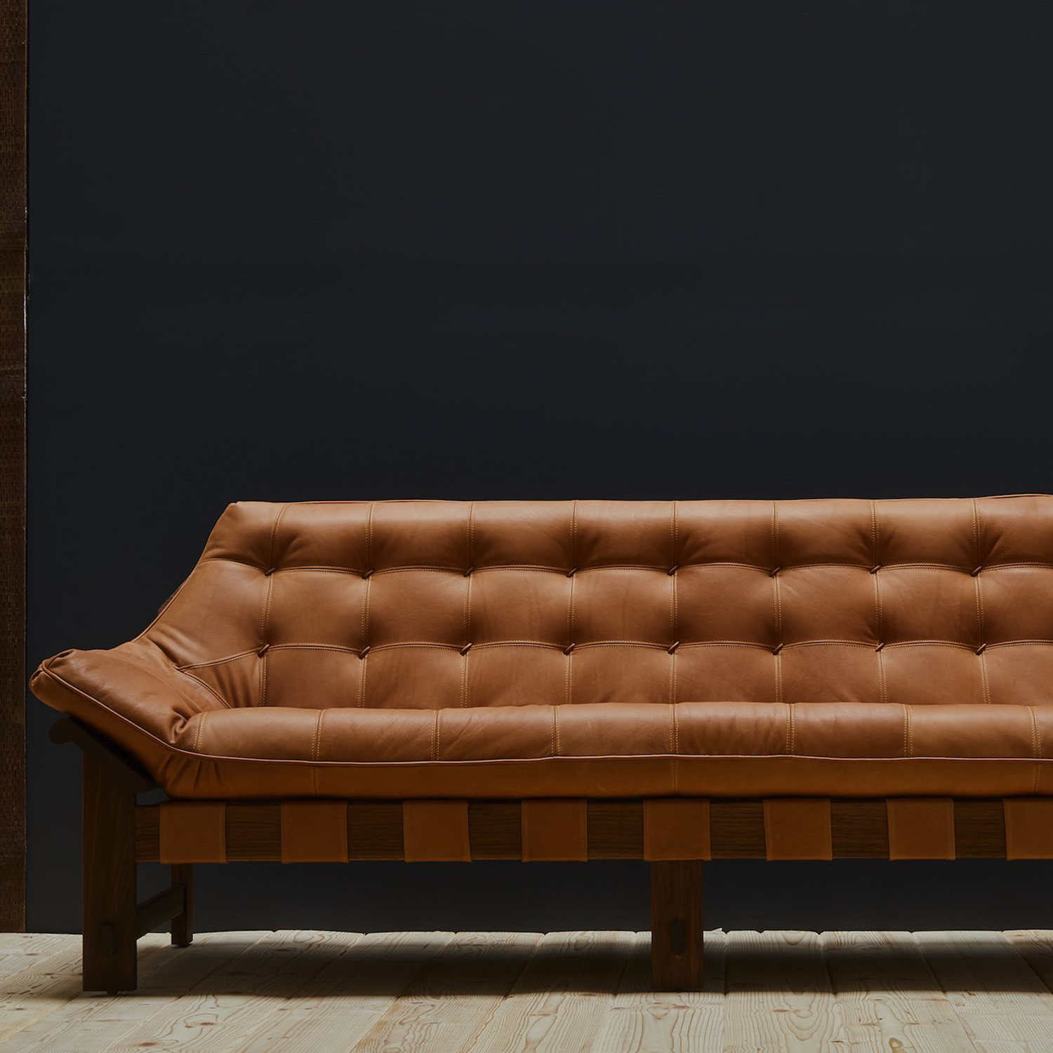 The Ojai Sofa features a solid white oak or solid walnut base and a single tufted leather cushion with leather straps.
