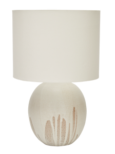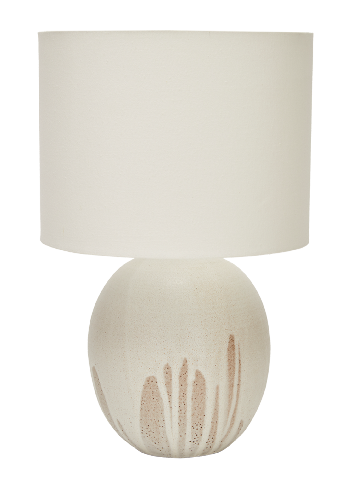 A classic lamp form, this large orb lamp is an elegant approach to a beloved lighting shape. Handmade in California with an oatmeal linen shade/diffuser and twisted brown cloth cord. Shape, size, and finish may vary slightly with each edition due to the unpredictable nature of studio pottery.