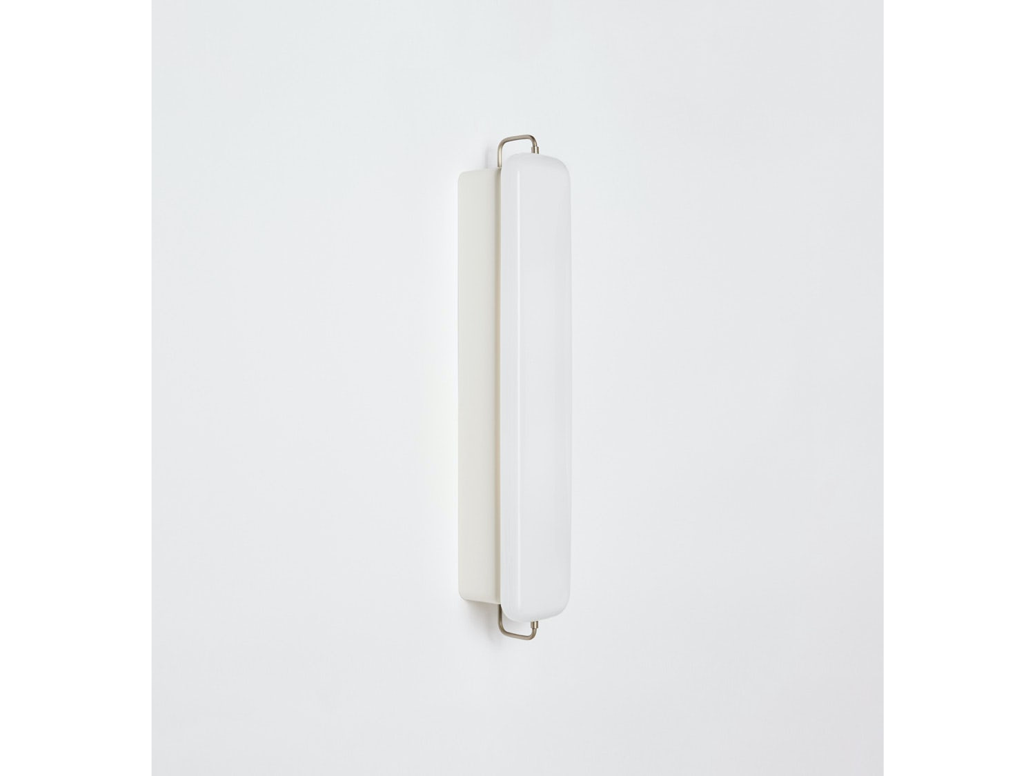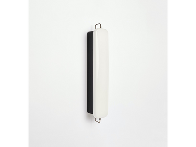 Park III features a pillow-shaped milk glass shade suspended by delicate metal rods from a slender enameled base. Referencing porcelain fixtures of the pre-war period, the piece acts as both a light box and wall-washer, creating a soft pool of flattering light.