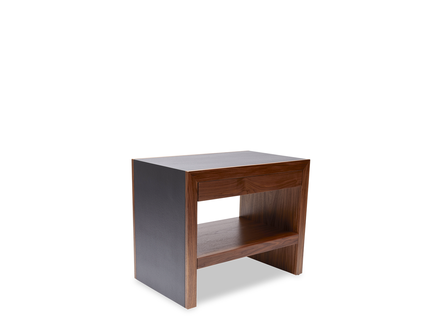 The Parkman Nightstand features a Parsons-style waterfall shape with cork on the top and sides and one drawer. Available in American walnut or white oak and 5 different cork colors.