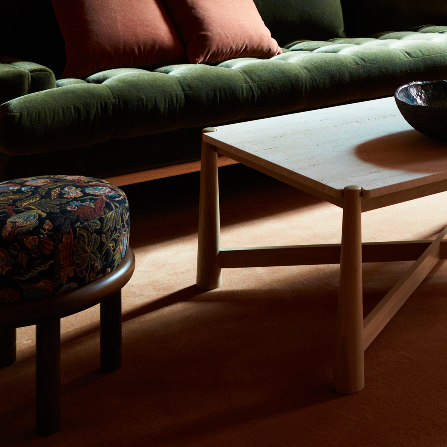The Petite Moreno Ottoman features a round solid wood base with four cylindrical legs and an upholstered top. Available in American walnut or white oak.