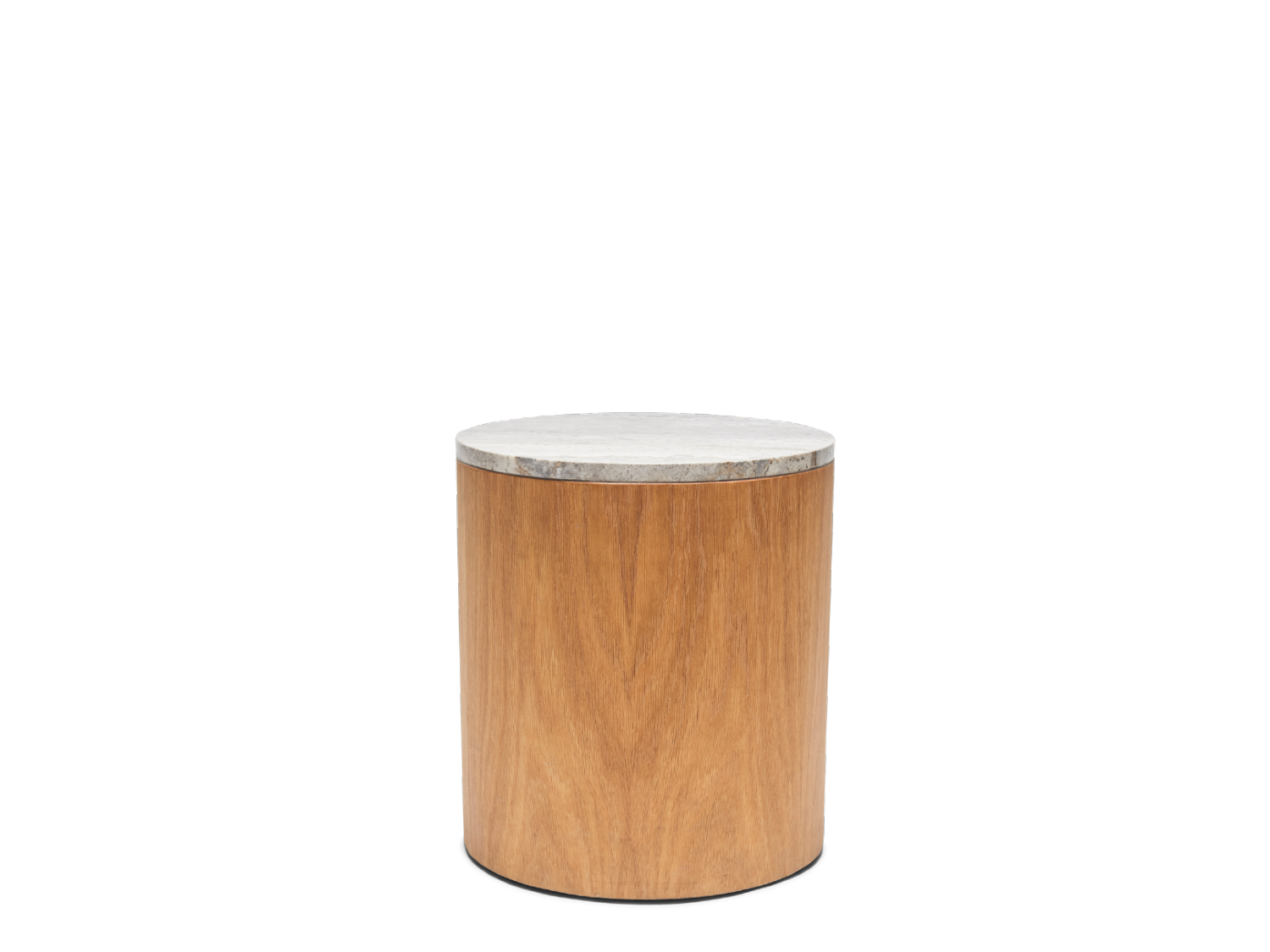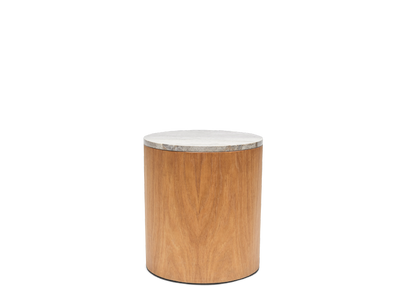 The Prospect Table is a drum table which features an American walnut or white oak exterior and a stone top.