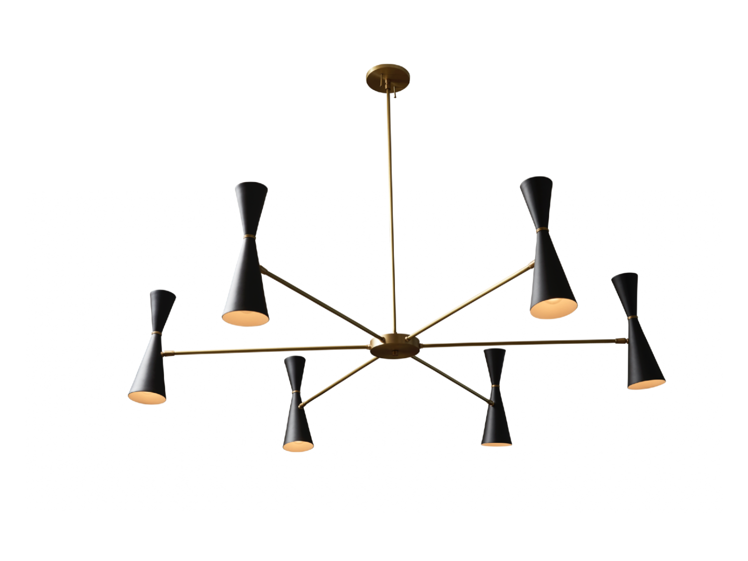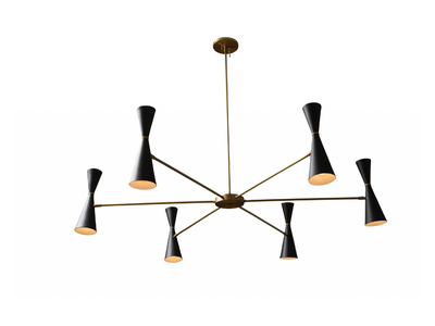 The Radial Chandelier features six double cone Shades that are centered around a spoked pendant. Available in gloss white or matte black powdercoat.