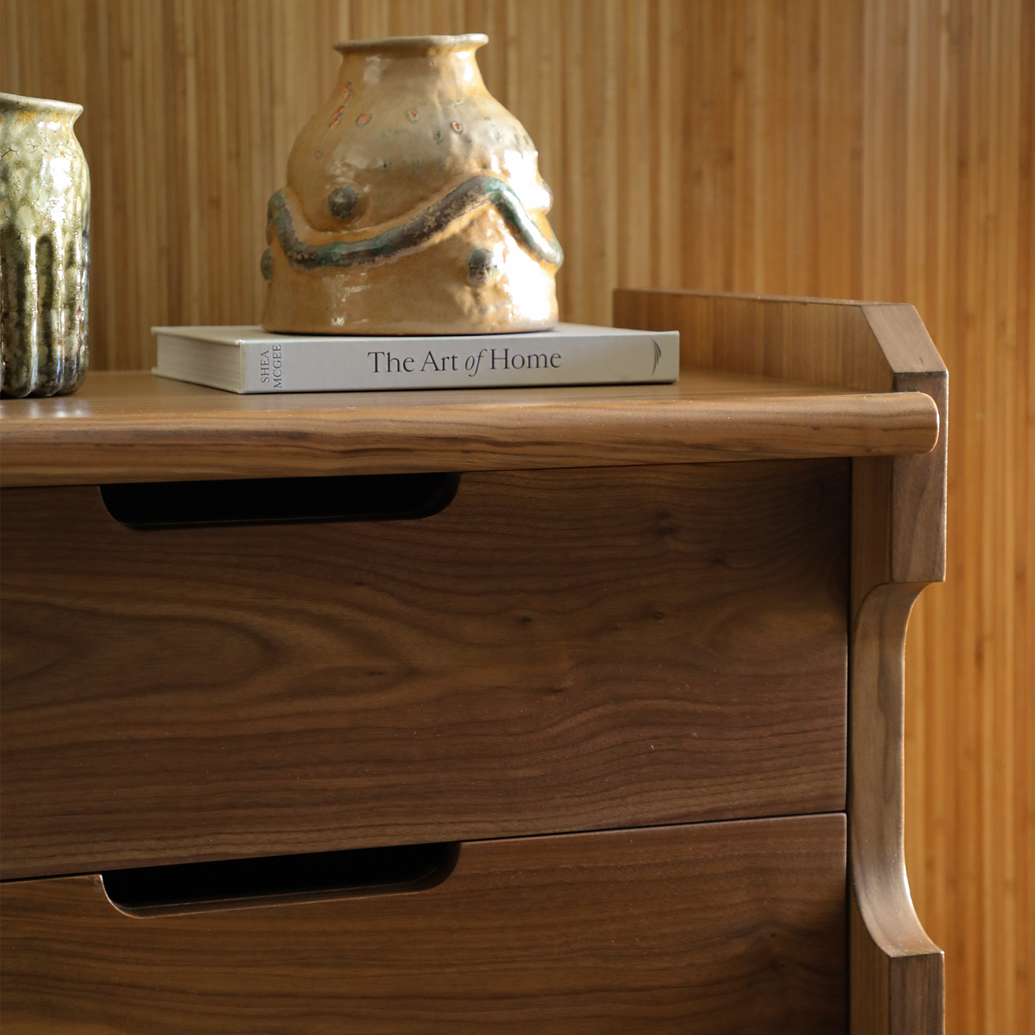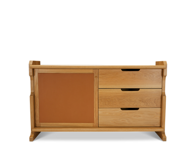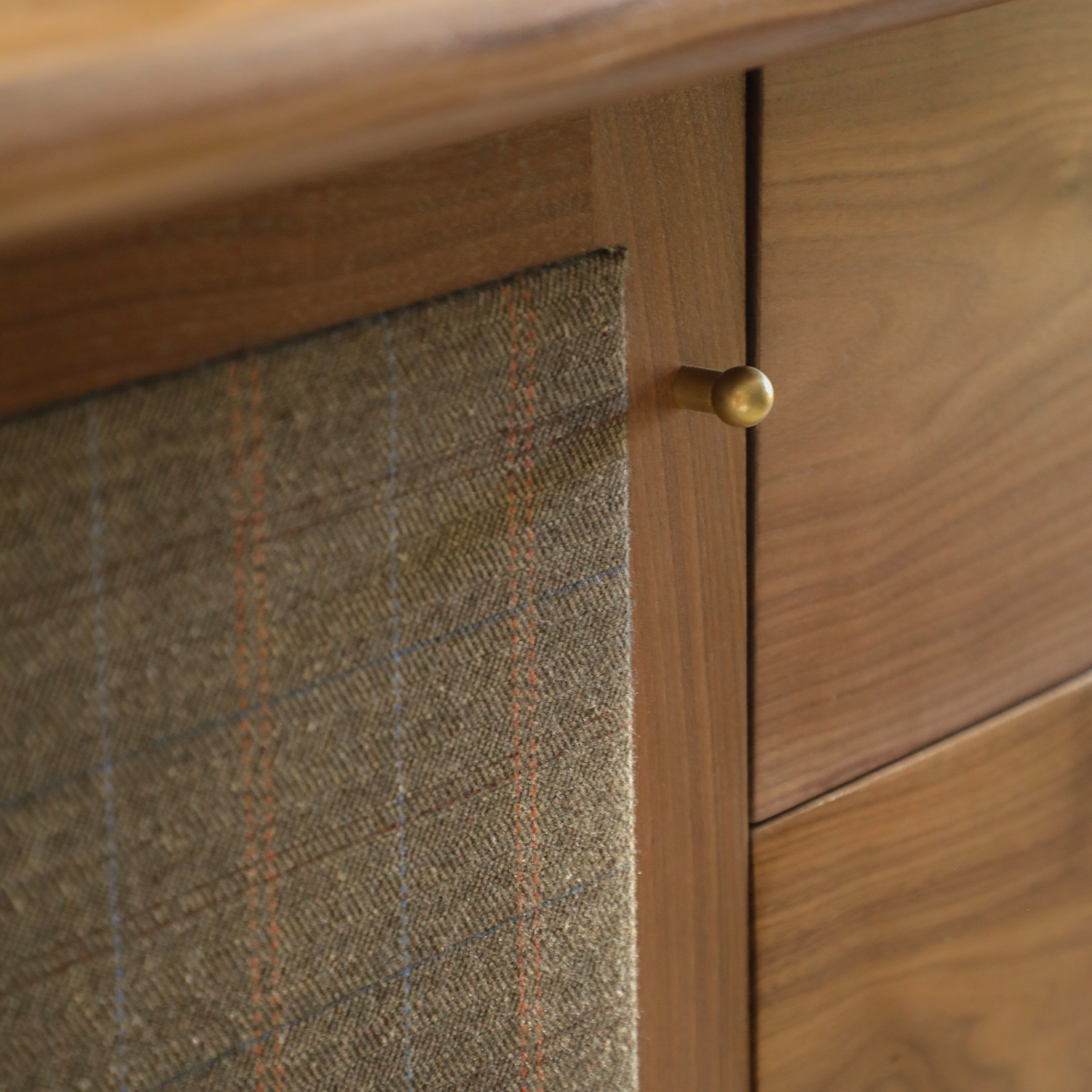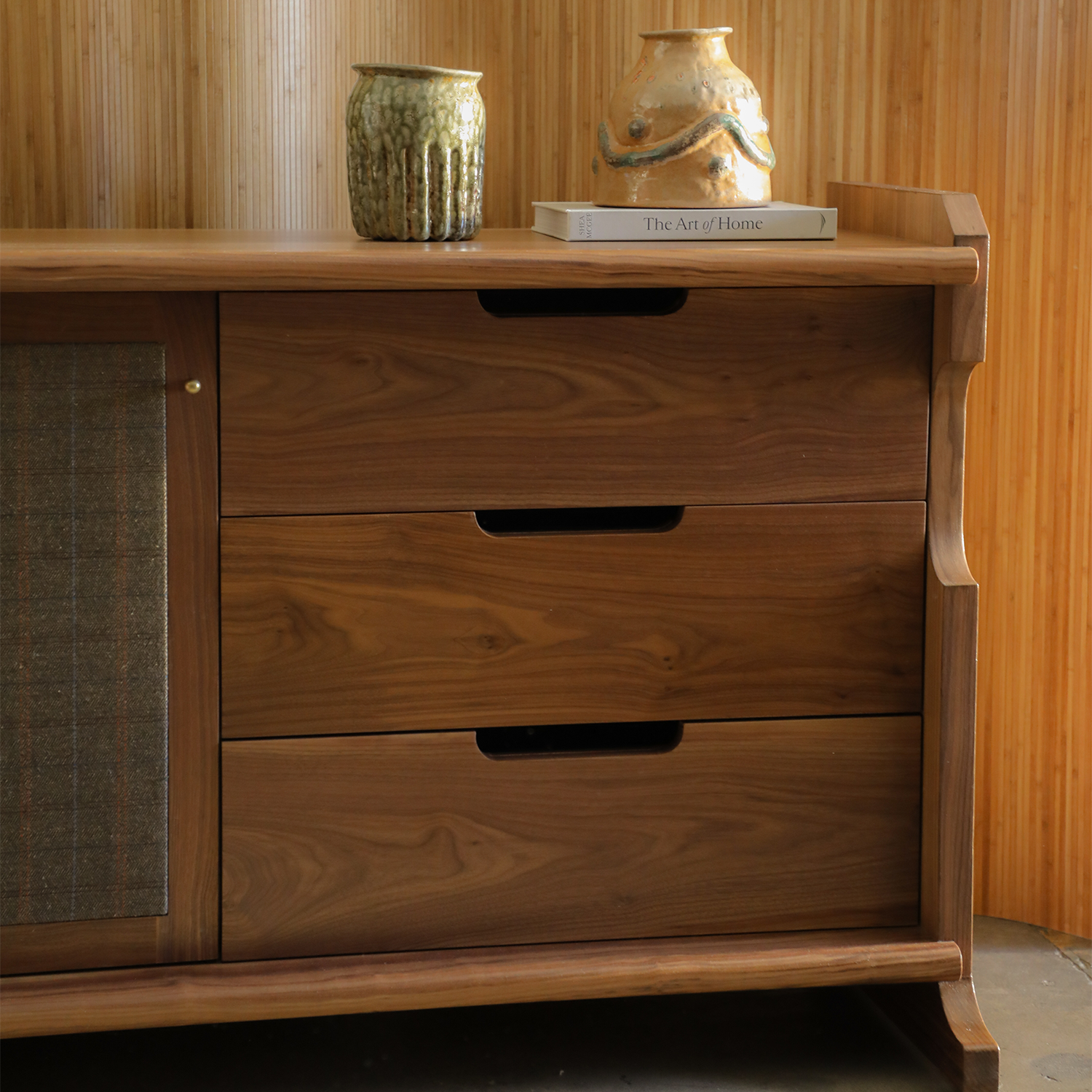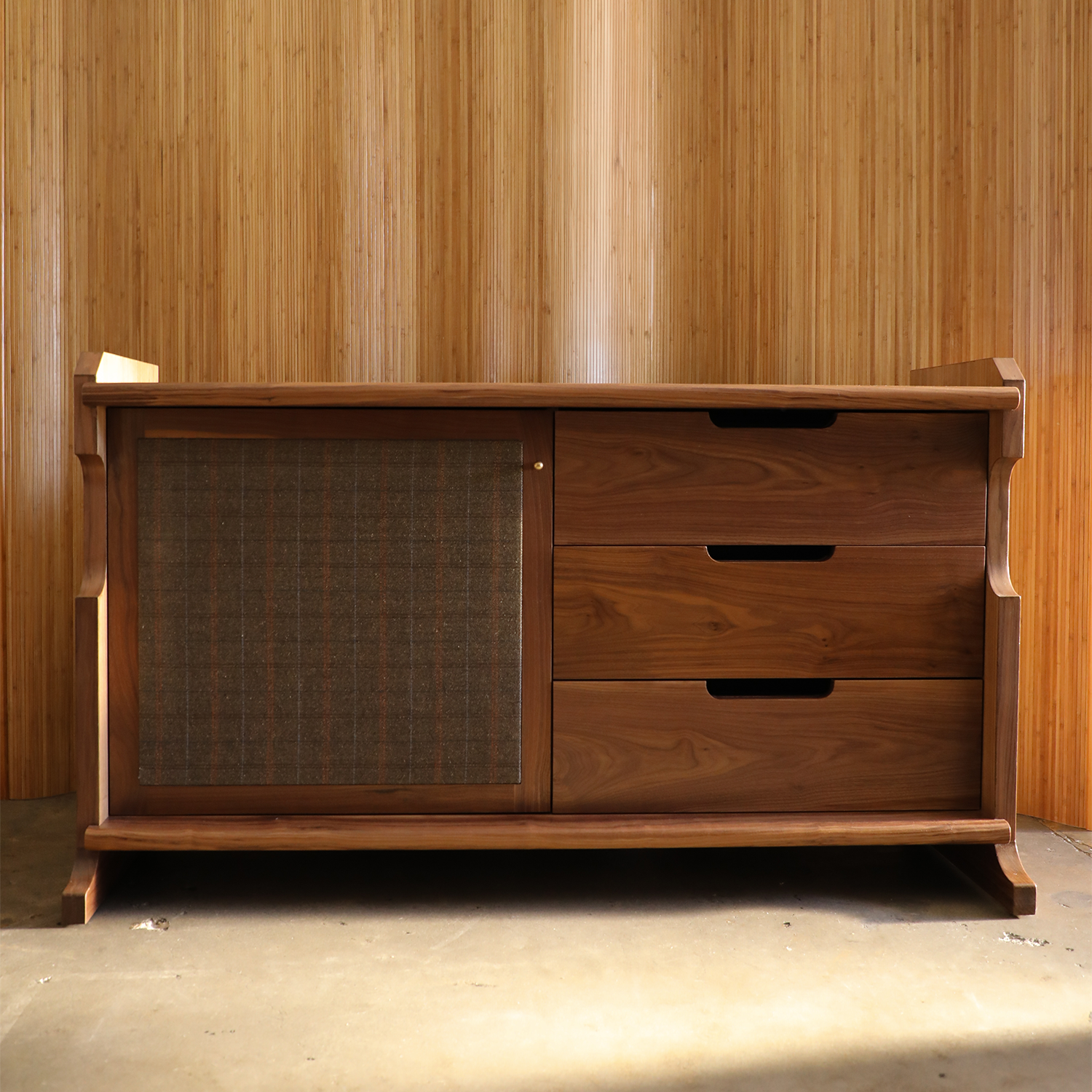 The San Rafael cabinet features a sturdy construction with upholstered doors and elegant contours. Cabinets can be custom-made in a two-door version with open storage or a one-door version with a bank of drawers.