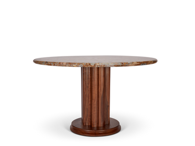 The San Rafael Round Pedestal Dining Table features a hand-carved fluted base and sleek bullnose stone top.