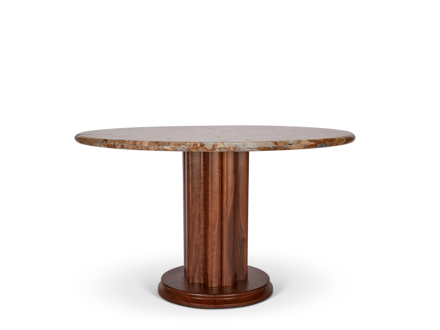 The San Rafael Round Pedestal Dining Table features a hand-carved fluted base and sleek bullnose stone top. View complete San Rafael Collection.