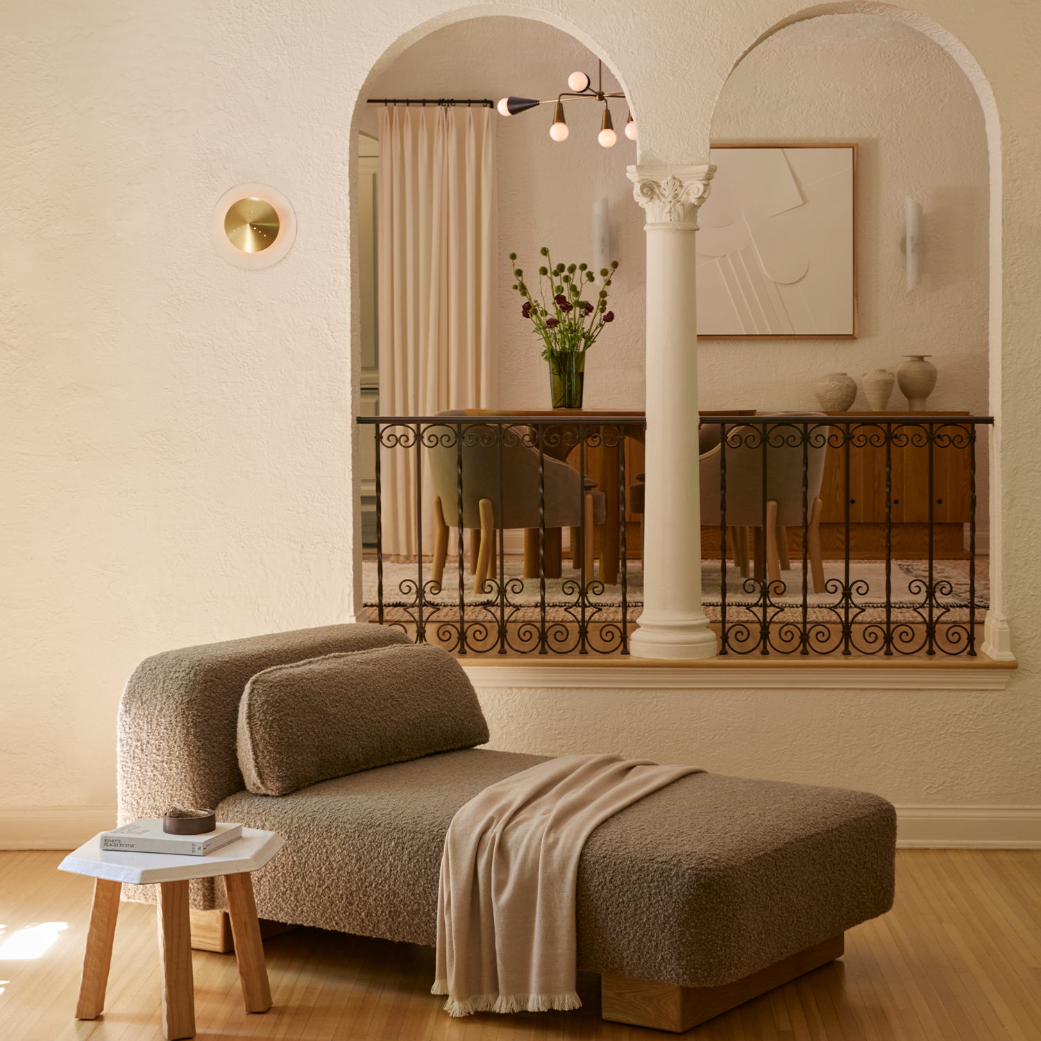 The Seymour Chaise calls to the streamlined shapes of Art Deco train cars with a curved back support and soft corners. The bed sits atop a monolithic leg that is reminiscent of railroad ties. The DISC Interiors x LF capsule collection pulls design inspiration from the romance of cross-continental train travel, and the sculptural designs of furniture at the turn of the twentieth century. View complete DISC Interiors x LF Collection.